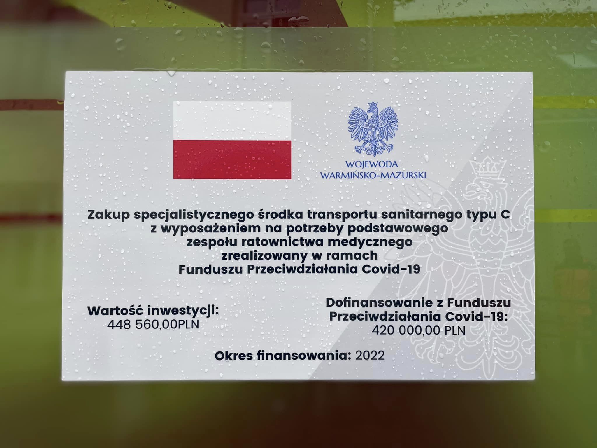 Zakup karetki pogotowia dofinansowany został z Funduszu Przeciwdziałania COVID-19 Wojewody Warmińsko-Mazurskiego w wysokości 420 000,00 zł. Całkowita wartość inwestycji wyniosła 448 560,00 zł.