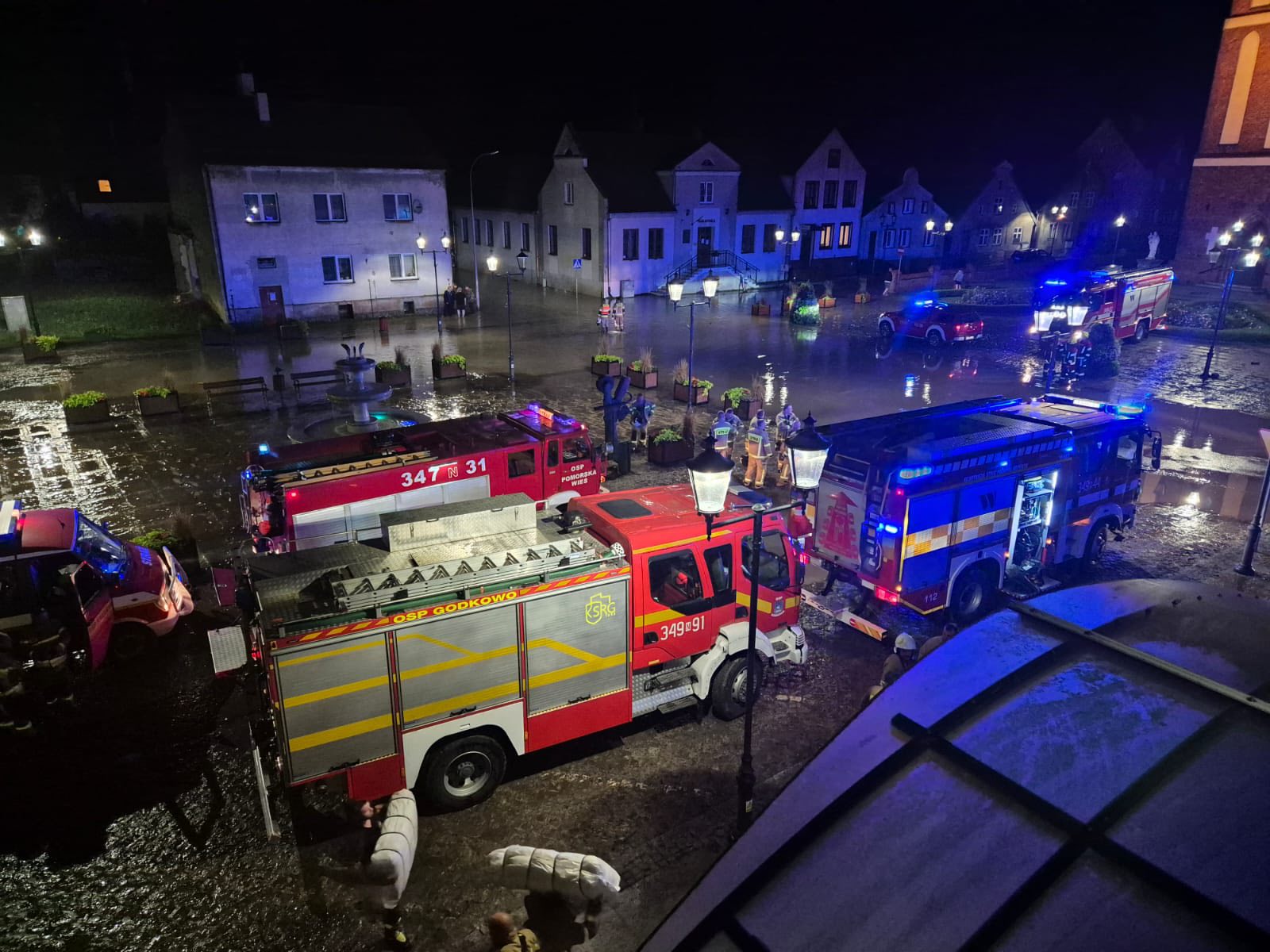 W Elblągu rzeka Kumiela gwałtownie wystąpiła z brzegów, zalewając budynki przy ul. Związku Jaszczurczego na odcinku około kilometra. Zagrożenie dotyczy również szpitala miejskiego. Na miejscu działało łącznie 20 zastępów straży pożarnej, w tym jednostki z powiatów ościennych.