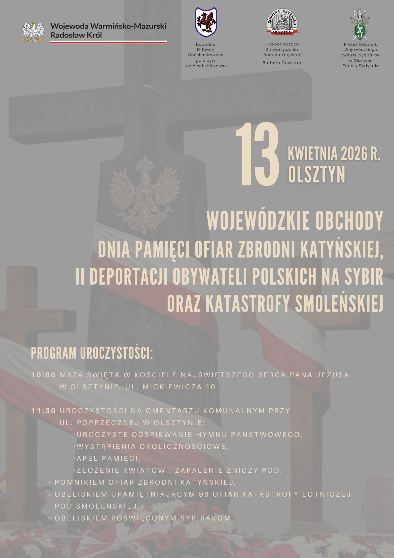 Zapraszamy na Wojewódzkie Obchody Dnia Pamięci Ofiar Zbrodni Katyńskiej, rocznicy II Deportacji Obywateli Polskich na Sybir oraz rocznicy Katastrofy Smoleńskiej, które odbędą się 13 kwietnia 2026 roku w Olsztynie.
