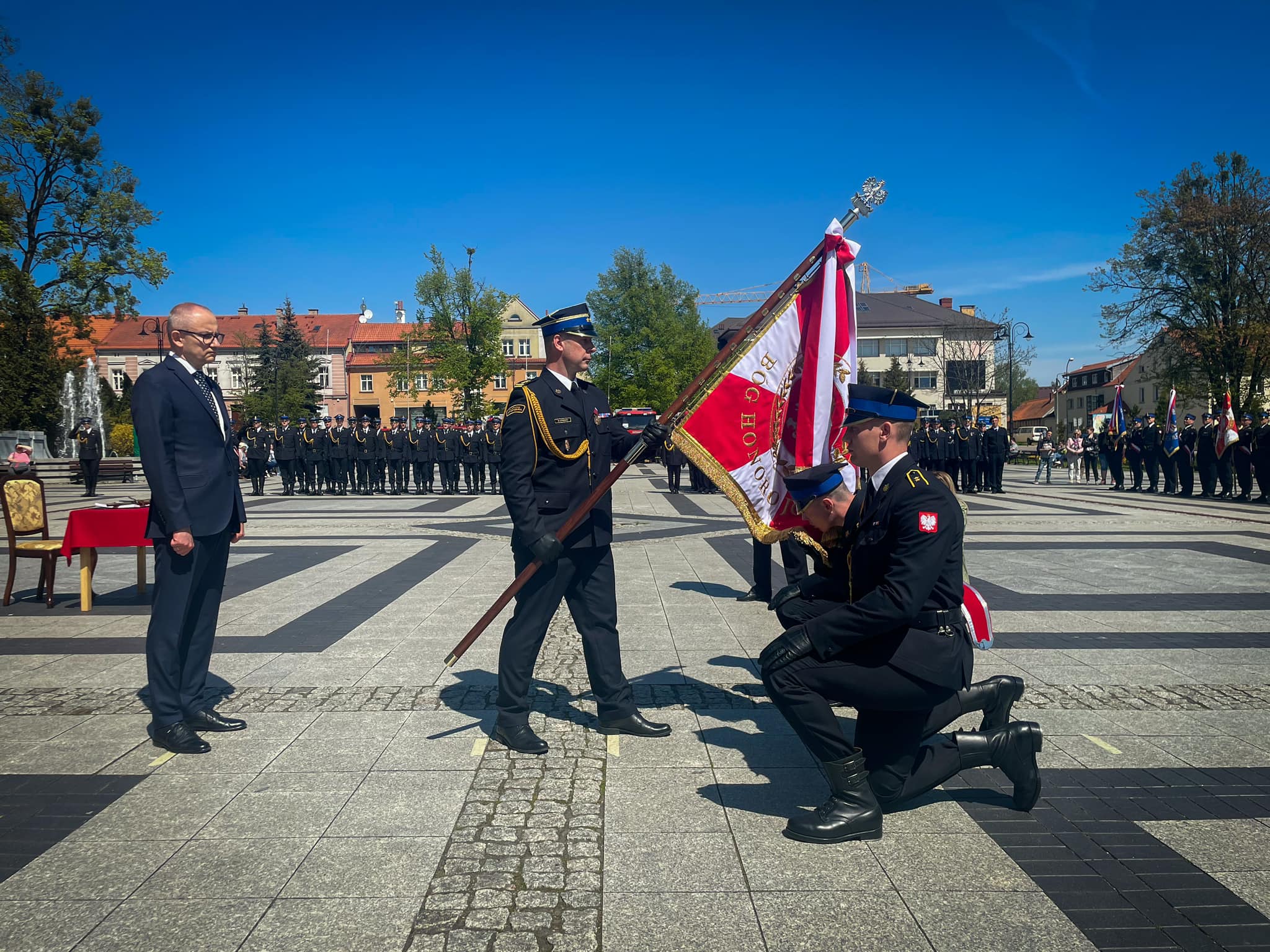 Następnie odbyło się uroczyste przekazanie sztandaru dla Komendy Powiatowej Państwowej Straży Pożarnej w Olecku. Sztandar został poświęcony, a następnie przekazany w ręce Komendanta Powiatowego PSP w Olecku. Ceremonii towarzyszyło symboliczne wbicie gwoździ w drzewiec sztandaru oraz złożenie podpisów w księdze honorowej. Było to ważne wydarzenie dla jednostki straży pożarnej, a zarazem dla całego regionu. To wyjątkowe wyróżnienie było szczególnie ważne dla strażaków z Olecka, którzy otrzymali sztandar jako wyraz uznania i podziękowania za ich pracę i poświęcenie. Podczas obchodów strażacy otrzymali również odznaczenia państwowe i awanse.