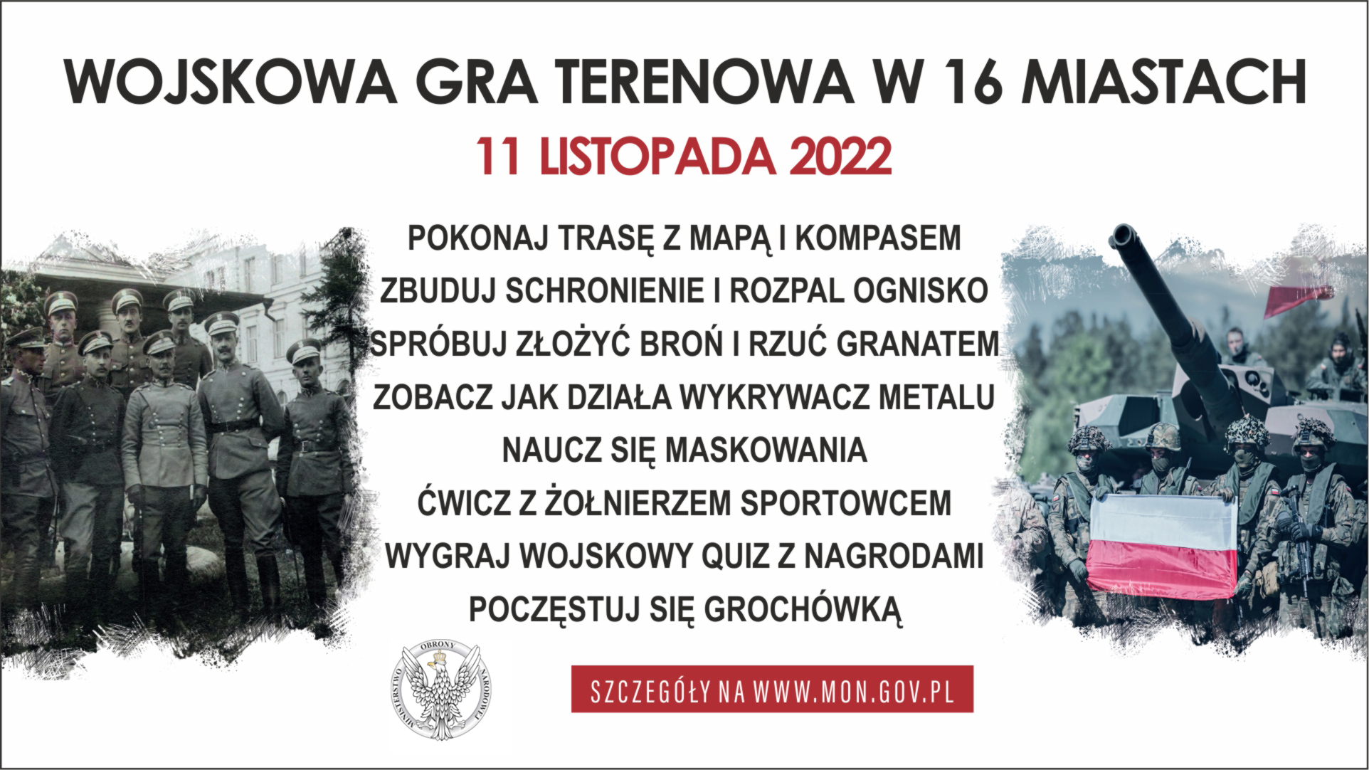 Wojskowe gry terenowe to zawody społeczno-obronne, które będą zlokalizowane wokół jednostek wojskowych, miejsc pamięci oraz skwerów i placów miast. Zawody odbędą się w każdym województwie - po jednej grze na województwo. Celem tak pomyślanej zabawy jest promowanie postaw patriotycznych i obronnych, przeżycie obchodów Narodowego Święta Niepodległości w połączeniu z dbałością o zdrowie społeczeństwa oraz promocją służby wojskowej. – Będzie to czas spędzony na wojskowej rywalizacji, a jednocześnie świetny sposób na uczczenie Biało-Czerwonej. Gwarantujemy dobrą zabawę i zapewnimy wojskowe wyżywienie.