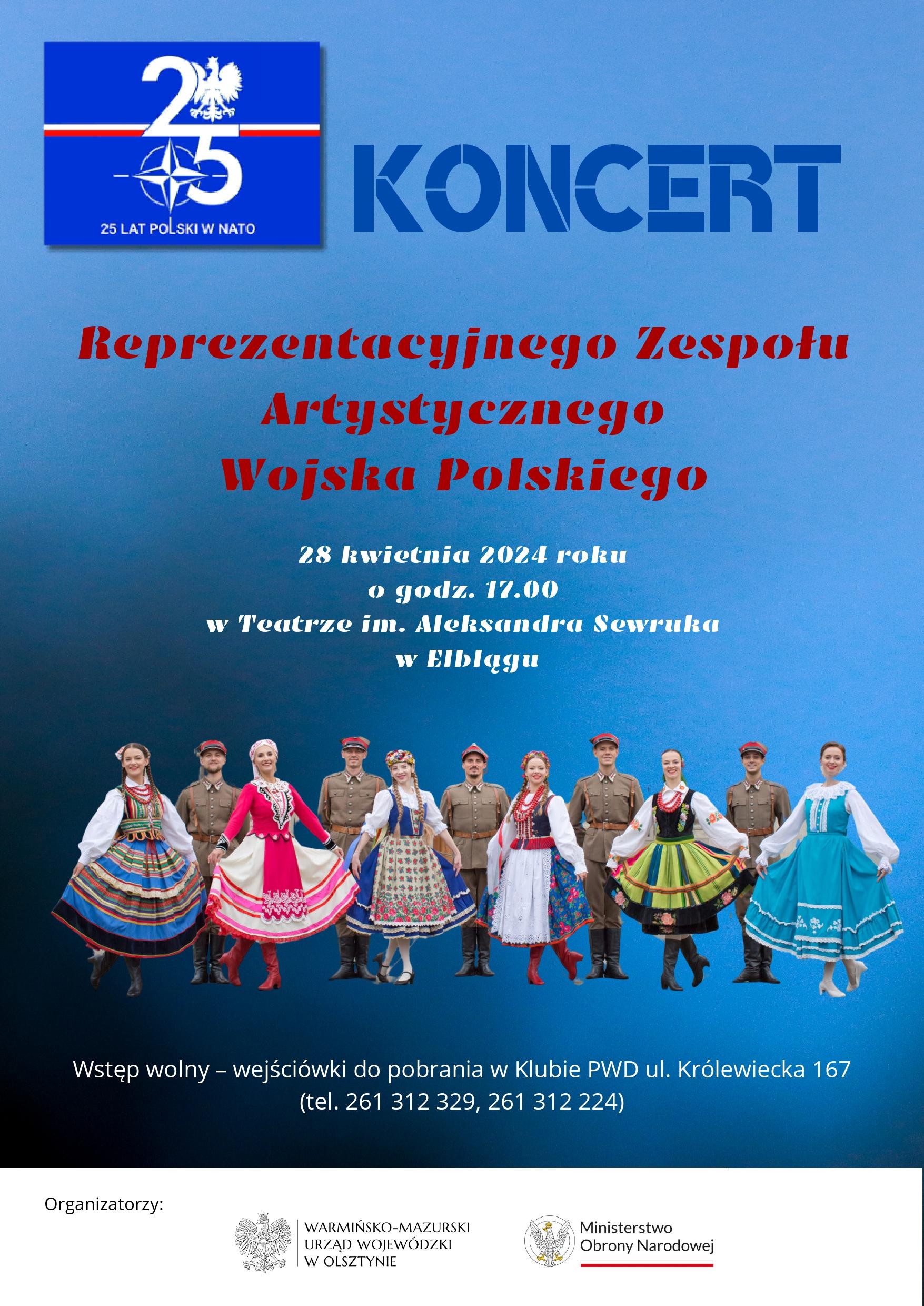 Wojewoda Warmińsko-Mazurski Radosław Król serdecznie zaprasza na Koncert w wykonaniu Reprezentacyjnego Zespołu Artystycznego Wojska Polskiego z okazji 25. rocznicy wstąpienia Polski do NATO, który odbędzie się 28 kwietnia 2024 r., o godz. 17:00 w Teatrze im. Aleksandra Sewruka w Elblągu, ul. Teatralna 11.