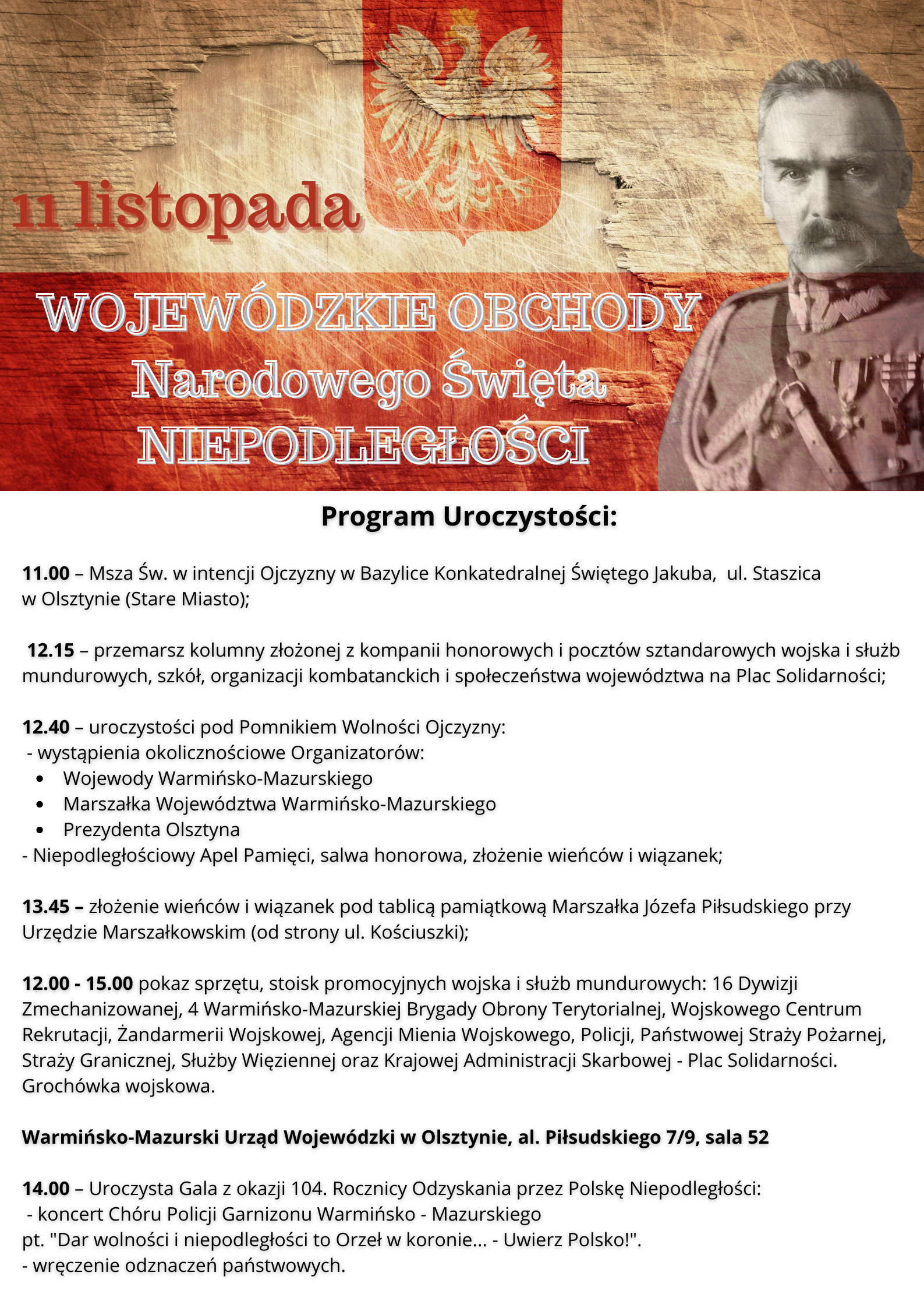 11.00 – Msza Święta w intencji Ojczyzny w Bazylice Konkatedralnej Świętego Jakuba, ul. Staszica w Olsztynie (Stare Miasto);