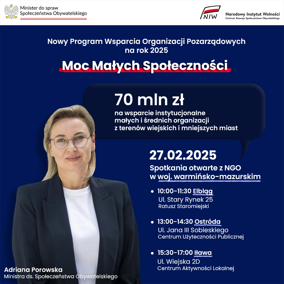 Ministra ds. Społeczeństwa Obywatelskiego Adriana Porowska oraz Podsekretarz Stanu w KPRM Marek Krawczyk serdecznie zapraszają przedstawicieli trzeciego sektora do udziału spotkaniach dotyczących nowego Rządowego Programu Wsparcia Organizacji Pozarządowych na rok 2025 – „Moc Małych Społeczności”.