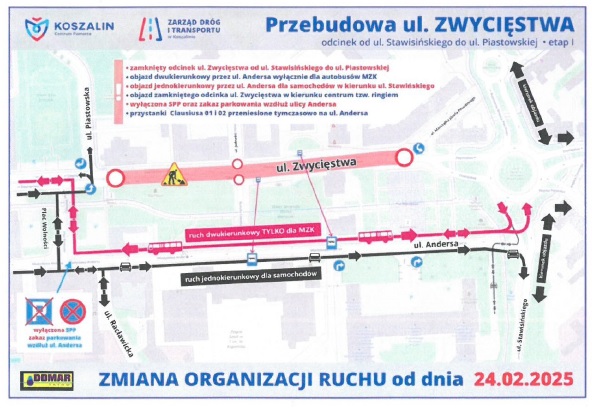 W związku z rozpoczęciem remontu ul. Zwycięstwa na odcinku od Placu Zwycięstwa do ul. Piastowskiej występują znaczne ograniczenia w ruchu oraz możliwości wjazdu i parkowania pojazdów w otoczeniu i parkingu budynku przy ul. Andersa 34. (Plan sytuacyjny znajduje się na dole strony). Za wszelkie utrudnienia przepraszamy.