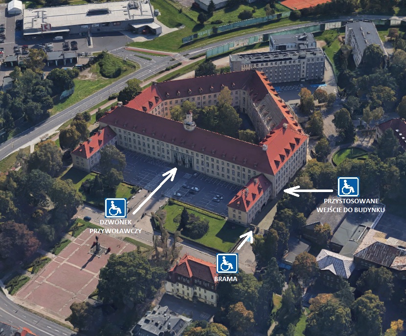 Dodatkowe, dostosowane wejście dla osób z dysfunkcją narządu ruchu, w tym dla osób poruszających się na wózkach inwalidzkich, znajduje się przy bramie wjazdowej od strony ul. Andresa. Przy bramce wejściowej umieszczona jest tabliczka zawierająca numery telefonów, pod którymi można uzyskać informacje - pomoc w wejściu do poszczególnych instytucji znajdujących się w obiekcie. Budynek wyposażony jest w windę osobową (oznaczoną również systemem Braille’a), umożliwiającą wygodne przemieszczanie się na wszystkie jego poziomy.