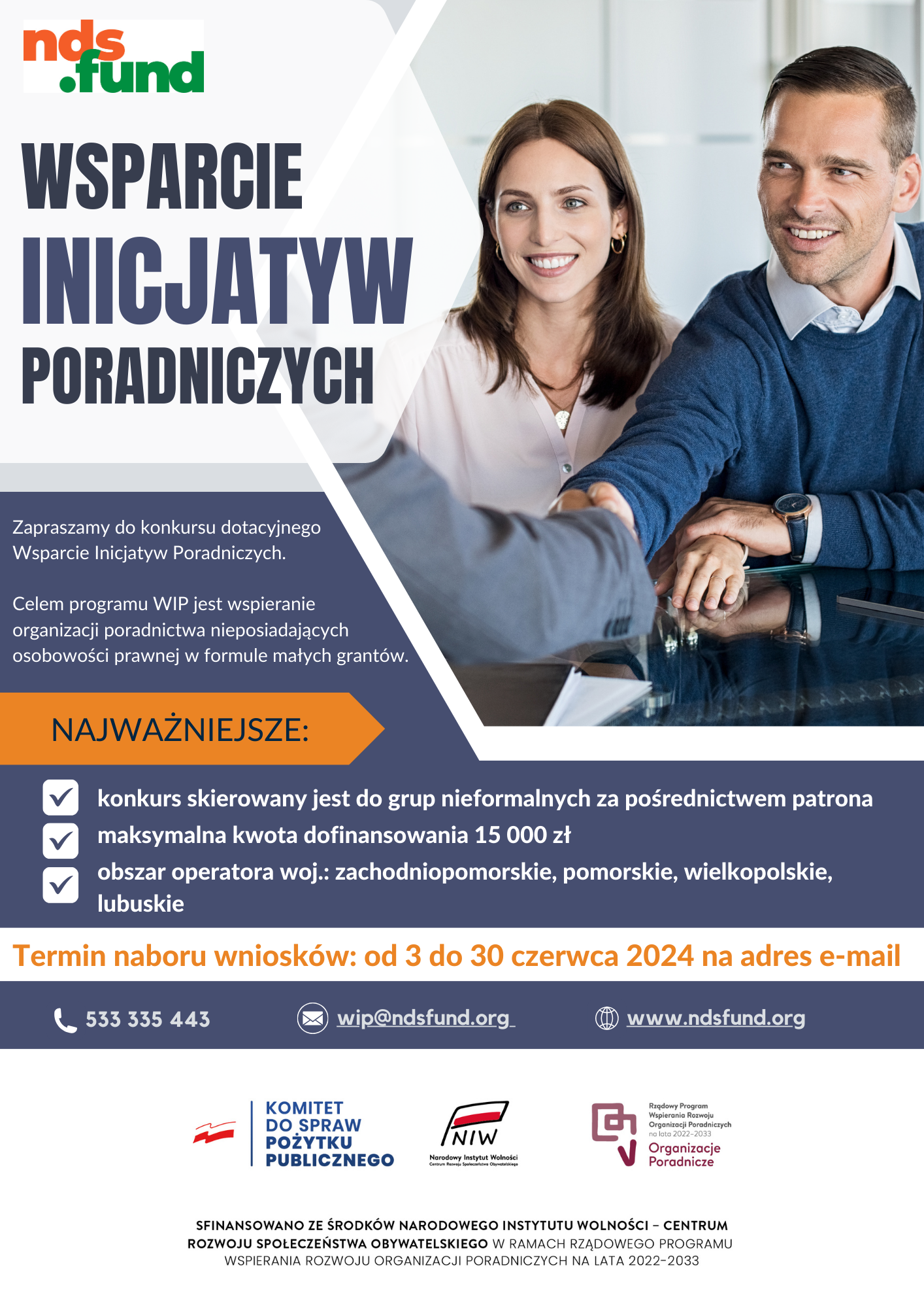 Informacja o naborze wniosków ramach projektu „Wsparcie Inicjatyw Poradniczych (WIP)” - do 30 czerwca 2024 r.