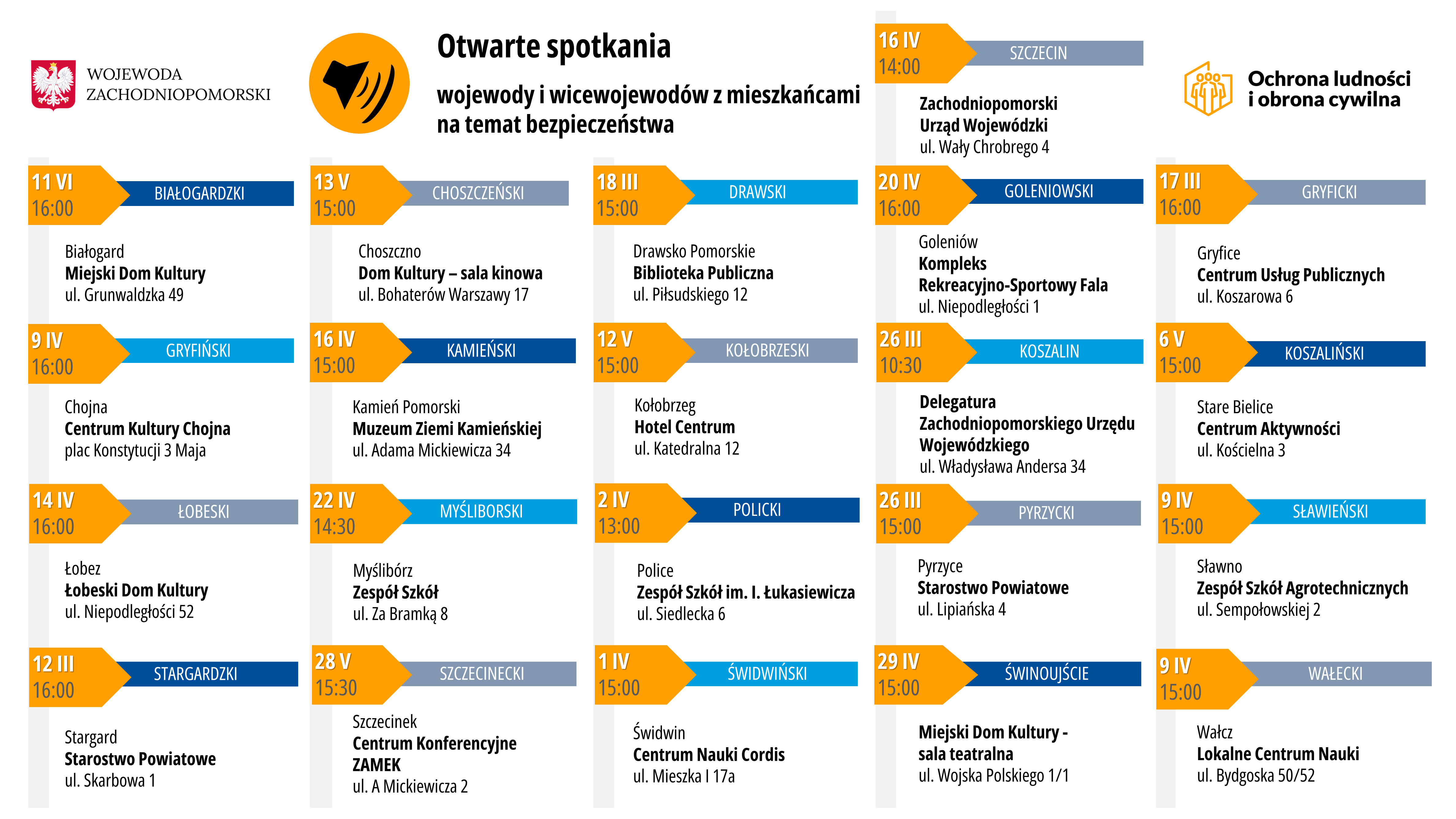 Zaplanowano 21 otwartych spotkań w każdym powiecie. W ich trakcie wojewoda lub wicewojewodowie oraz komendanci powiatowych komend PSP w regionie spotkają się z mieszkańcami i przekażą najważniejsze kwestie związane z bezpieczeństwem.