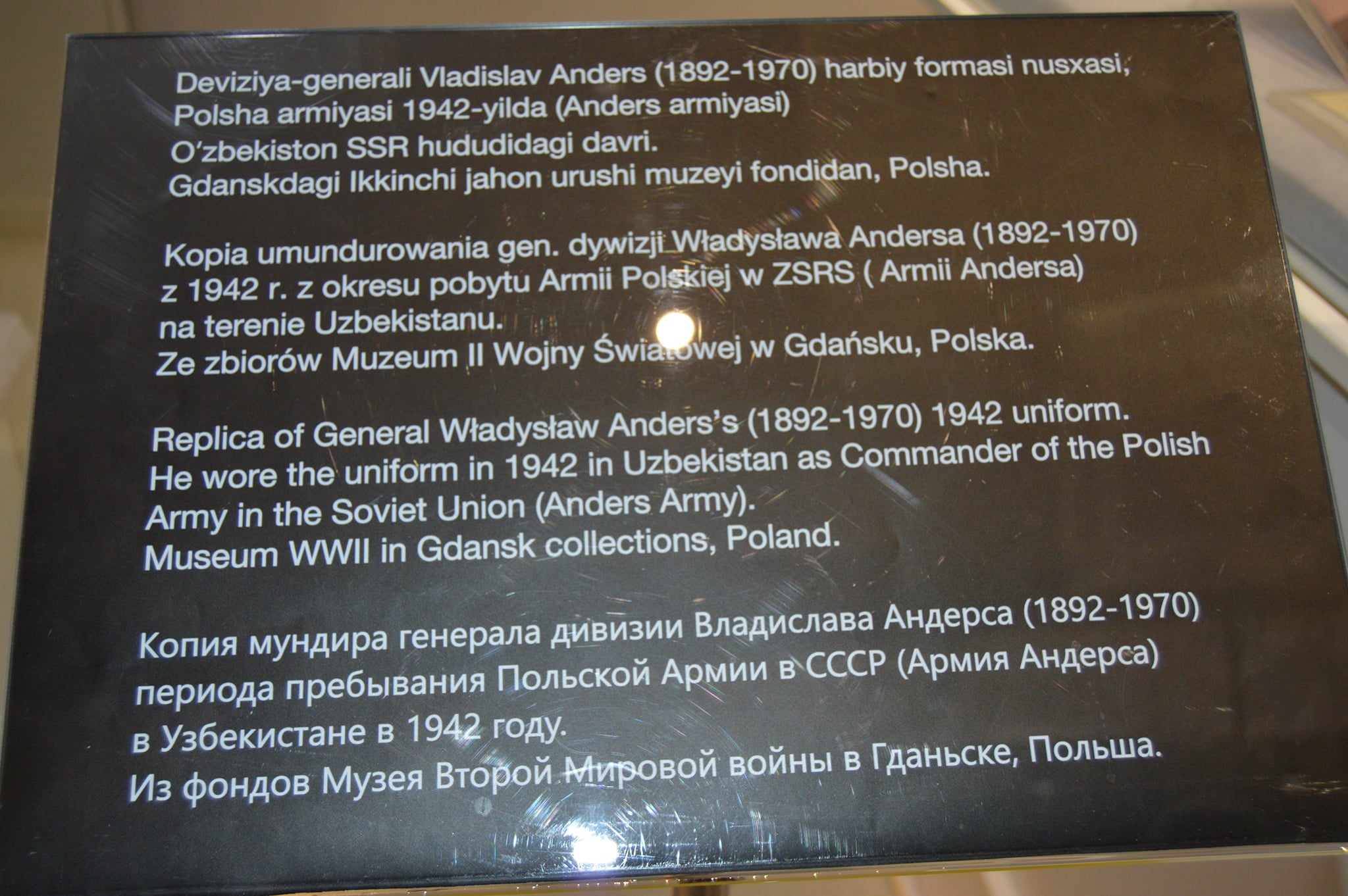 Благодаря финансированию Музеем Второй мировой войны в Гданьске, реплика мундира Генерала Владислава Андерса, была размещена в музейном комплексе «Шон-Шараф» в Ташкенте, которая позволит посетителям узнать о судьбе польских солдат и их вкладе к победе над фашизмом. Открытие польской экспозиции в крупнейшем государственном музее Узбекистана стало возможным благодаря инициативе Кароля Навроцкого, предыдущего директора Музея Второй мировой войны, а в настоящем президента Института национальной памяти и поддержки Радослава Грука, Посла Республики Польша в Узбекистане. Открытие выставки сопровождалось церемонией подписания договора о сотрудничестве между Государственным музеем «Шон - Шараф» (Славы) в Мемориальном центре «Парк Победы» Министерства обороны Республики Узбекистан и Музея Второй мировой войны в Гданьске. Подписание договора позволит проводить научные исследования и обмениваться документами касающихся судьбы солдат армии Генерала Владислава Андерса на территории бывшего Советского Союза и узбекских солдат в рядах Красной армии, погибших в Польше во время Второй мировой войны..