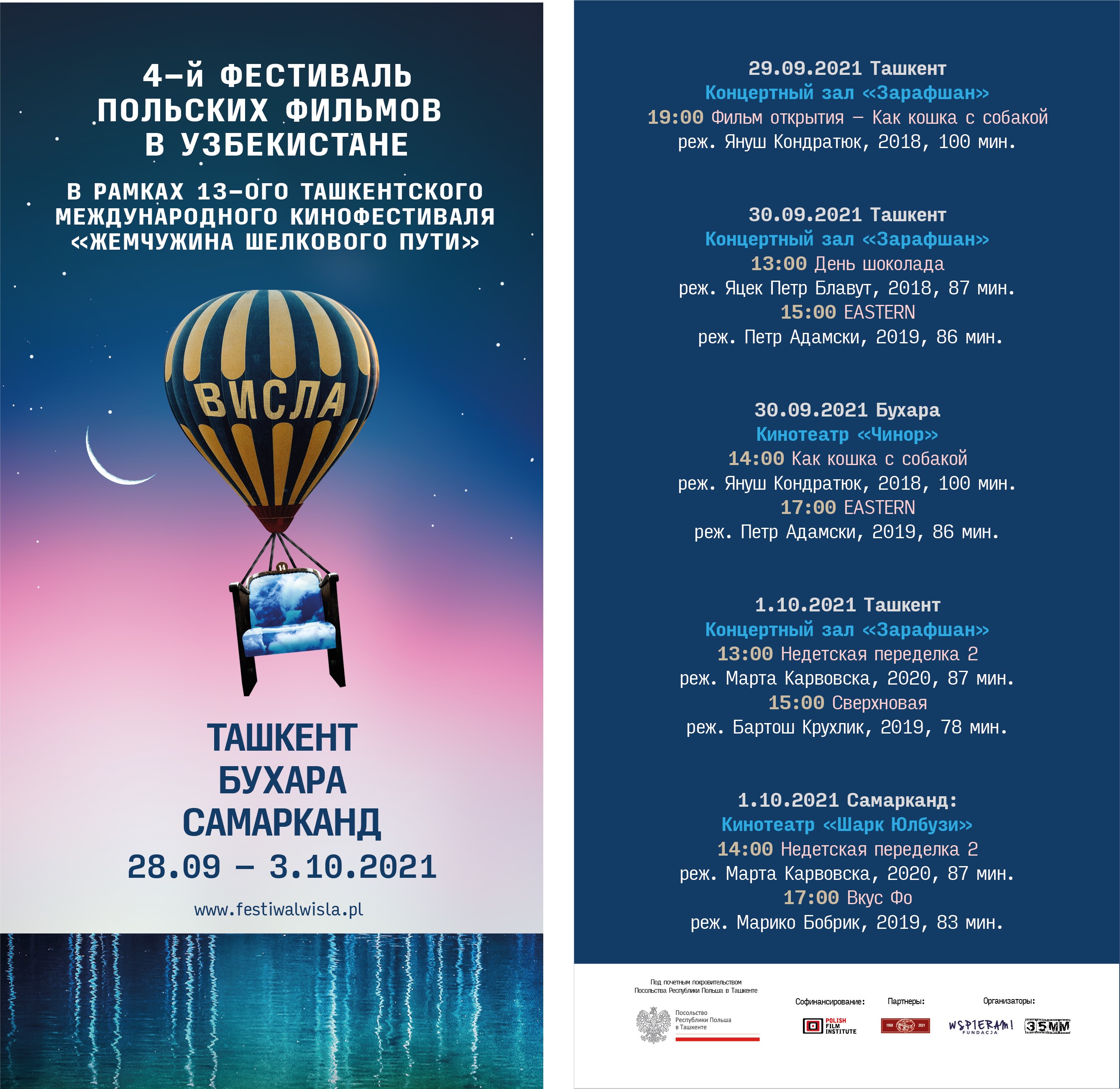 Под патронатом Посольства Республики Польша в Ташкенте с 29 сентября по 3 октября текущего года в рамках 4-го Польского кинофестиваля «Висла» в Узбекистане состоится показ польского кино. Данное мероприятие является частью возрожденного после долгого перерыва международного кинофестиваля в Ташкенте, получившего название «Жемчужина Шелкового пути».
