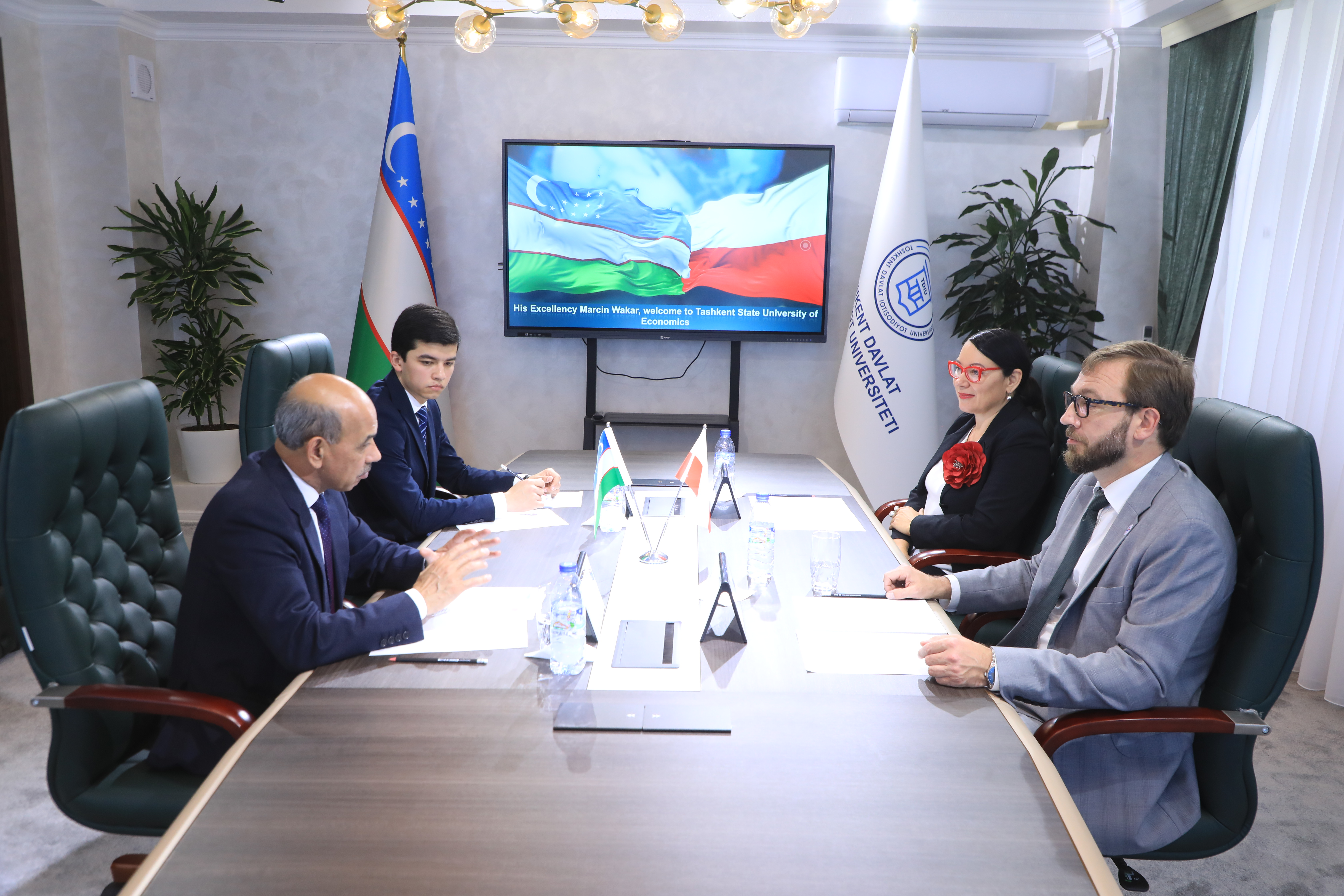 Polsha Respublikasining O‘zbekiston Respublikasidagi Muvaqqat ishlar vakili Marchin Vakar Toshkent davlat iqtisodiyot universiteti tashrif buyurib, oliygoh Rektori Teshabayev To‘lqin Zokirovich bilan uchrashdi. Polsha elchixonasi rahbariga universitetda faoliyat ko‘rsatayotgan polyak tili markazi haqida ma’lumot berildi, NAWA o’qituvchisi Agneszka Mikulec boshchiligidagi guruh mehmonni polyak tilida kutib oldi. Uchrashuvda ikki tomonlama hamkorlikning istiqbollari muhokama etildi hamda O‘zbekiston-Polsha rektorlar forumining ikki mamlakat oliy ta’lim muassasalari o‘rtasidagi aloqalarni mustahkamlashga ijobiy ta’siri ta’kidlandi. Rektor Gdansk universiteti va Krakovdagi Iqtisodiyot universiteti singari Polsha oliy o‘quv yurtlari bilan hamkorlik haqida mamnuniyat bilan so‘zlab, talabalar va o‘qituvchilar almashinuvining davom etishiga, shuningdek, ilmiy tadqiqotlar sohasida qo‘shma tashabbuslarga umid bildirdi.