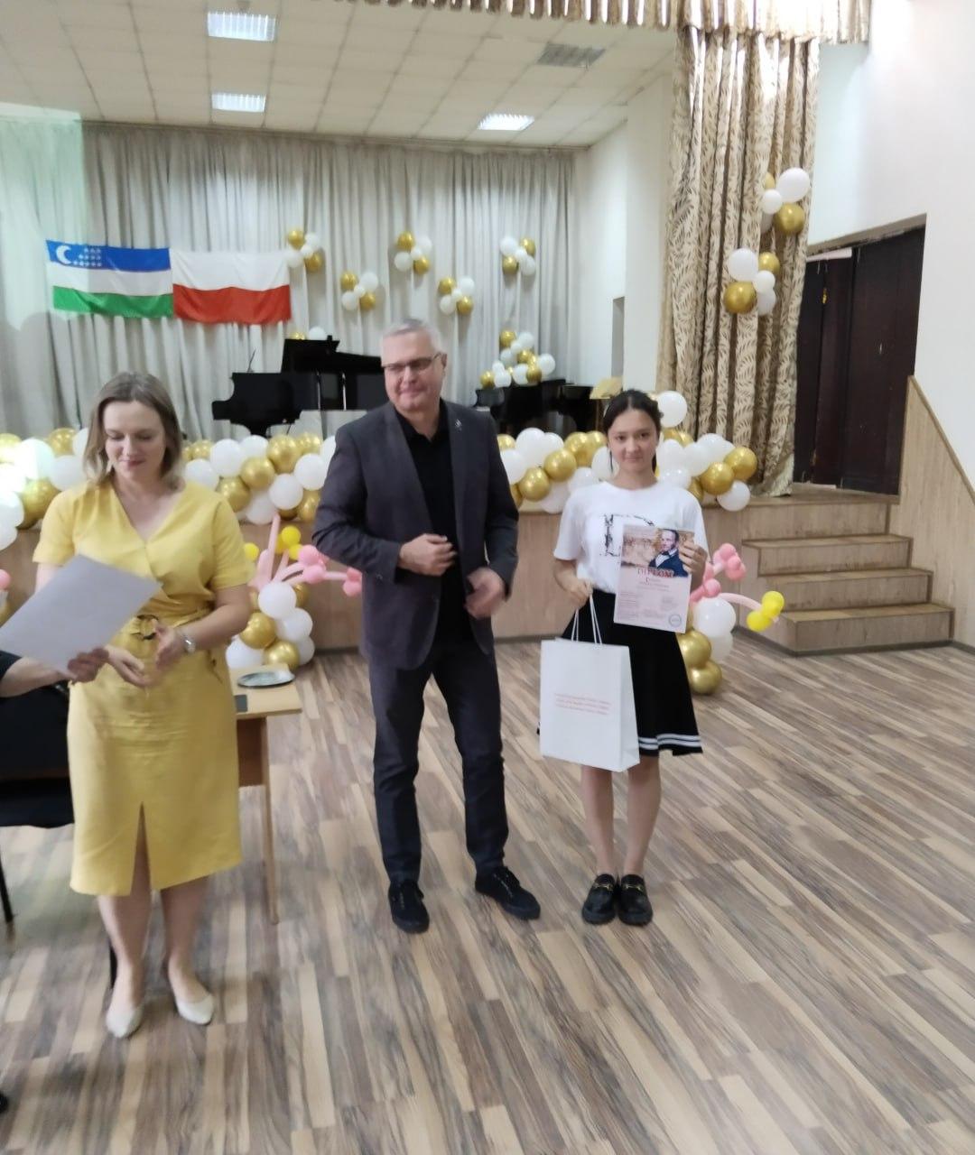 Студенты Республиканской музыкальной школы им. Глиера в Ташкенте приняли участие в конкурсе, посвященном творчеству известного польского композитора Станислава Монюшко. За проявление своего музыкального таланта в произведениях выдающегося поляка молодежь получила высокую оценку жюри, членом которого был, в частности, полковник Томаш Кучко, атташе обороны при посольстве Польши в Ташкенте. Все исполнители получили из его рук дипломы и награды, учрежденные посольством Польши в Ташкенте и департаментом обороны. Сердечная благодарность председателю Ассоциации "Полония" г-же Ирэне Вахабовой, главному организатору мероприятия и участникам конкурса, популяризирующим польскую классическую музыку в Узбекистане.