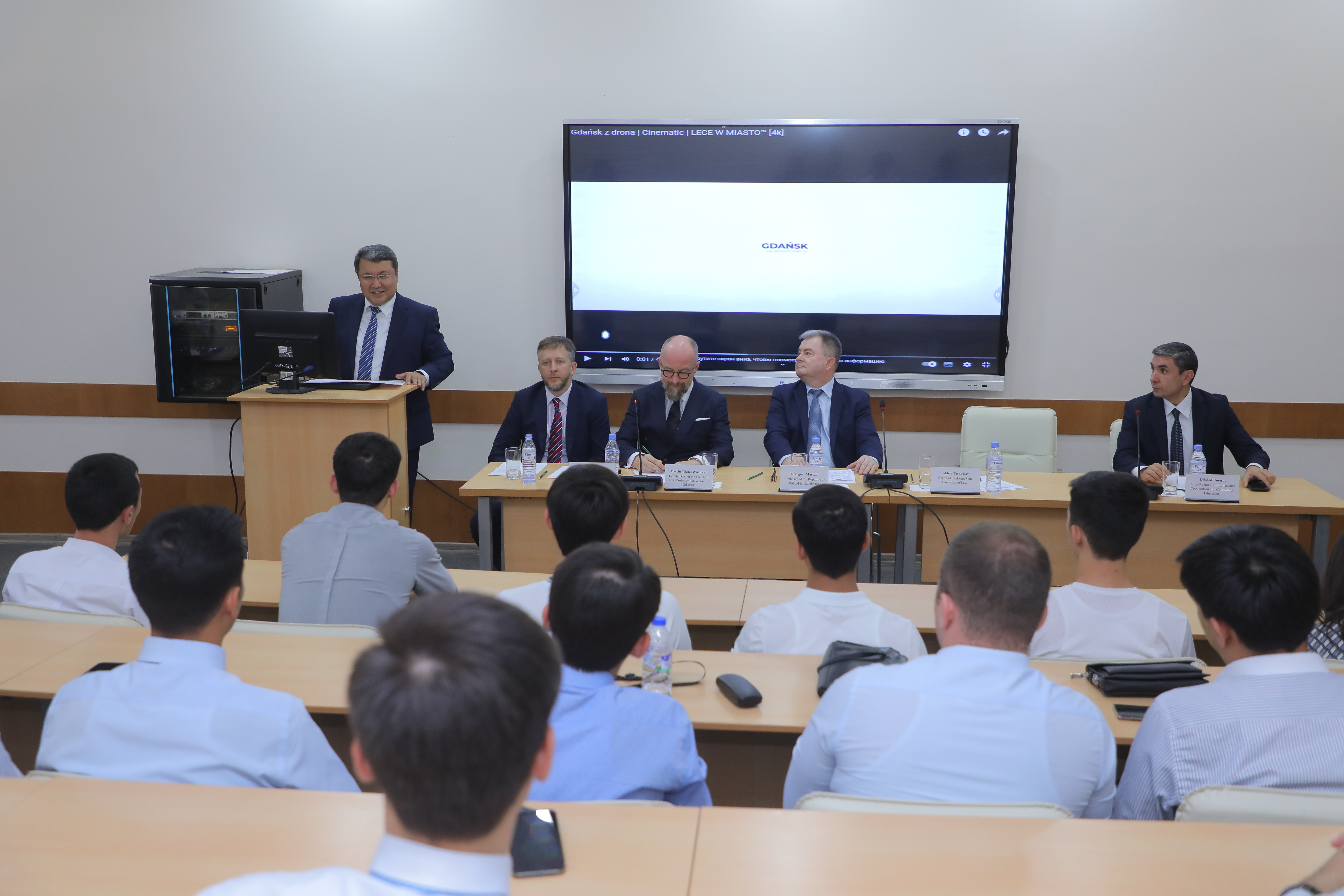 Charge d’affaires a.i. RP w Uzbekistanie Grzegorz Marczak, prof. Marcin Michał Wiszowaty - Prodziekan ds. Współpracy Międzynarodowej i Rozwoju Wydziału Prawa i Administracji Uniwersytetu Gdańskiego, prof. Edvardas Juchnevicius z Wydziału Prawa i Administracji Uniwersytetu Gdańskiego wraz z rektorem Taszkenckiego Państwowego Uniwersytetu Prawa (TSUL) Akbarem Taszkułowem wzięli udział w uroczystości wręczenia dyplomów studentom TSUL, którzy w ramach programów PILSP i Erasmus+ studiowali w mijającym roku akademickim na Wydziale Prawa i Administracji Uniwersytetu Gdańskiego.