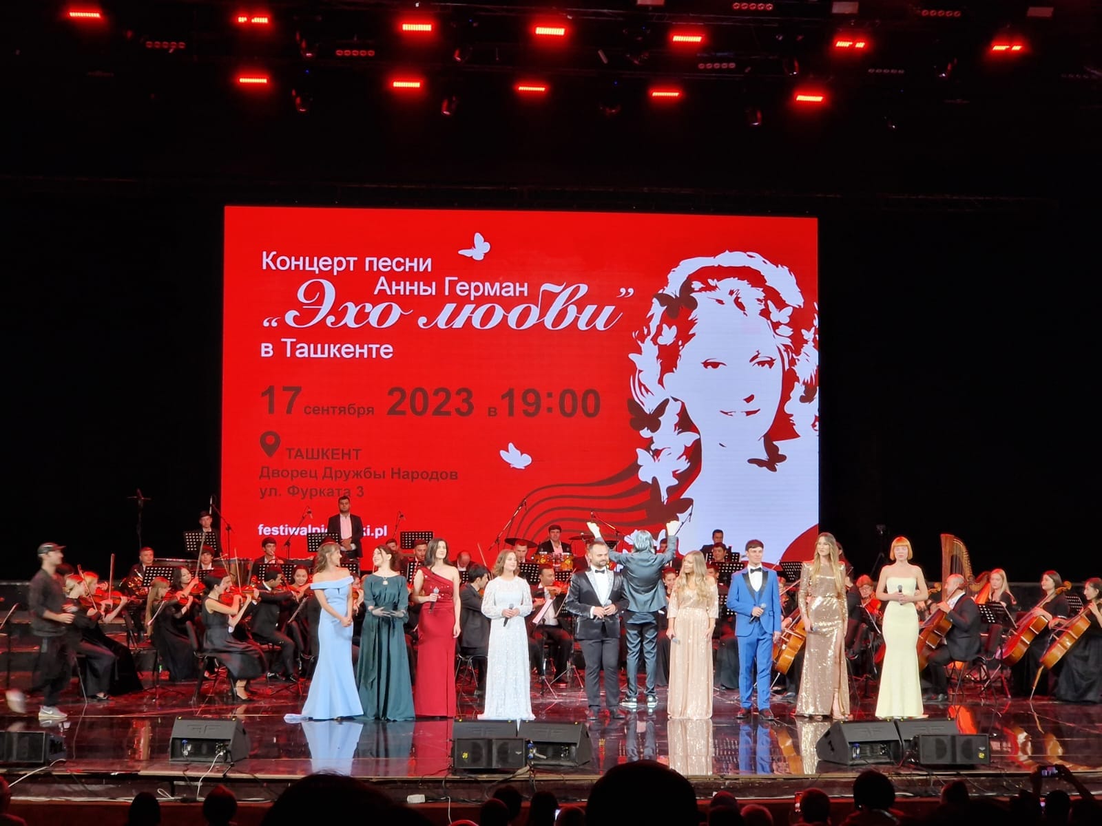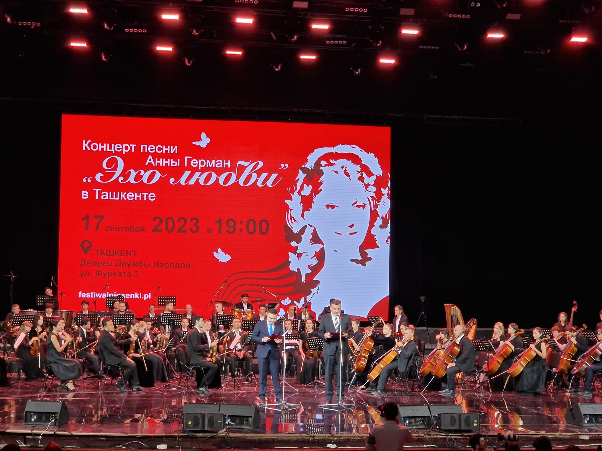 Od wystąpienia Radosława Gruka, Ambasadora RP w Taszkencie rozpoczął się długo wyczekiwany wieczór w którym przed tłumnie zgromadzoną w Pałacu Przyjaźni Narodów taszkencką publicznością, piosenki z akompaniamentu Anny German wykonali artyści z Polski, Uzbekistanu i Ukrainy. Pod batutą maestra Alibeka Kabduraxmonova i przy akompaniamencie Narodowej Orkiestry Symfonicznej Republiki Uzbekistanu wystąpili soliści; Marta Majek, Izabela Szafrańska, Anastazja Goriełow, Michał Matuszewski, Kaja Mianowana, Marta Słociak-Wiszniewska, Lesia Pryshlyak, Feride Girgin, Denis Sotnikov.