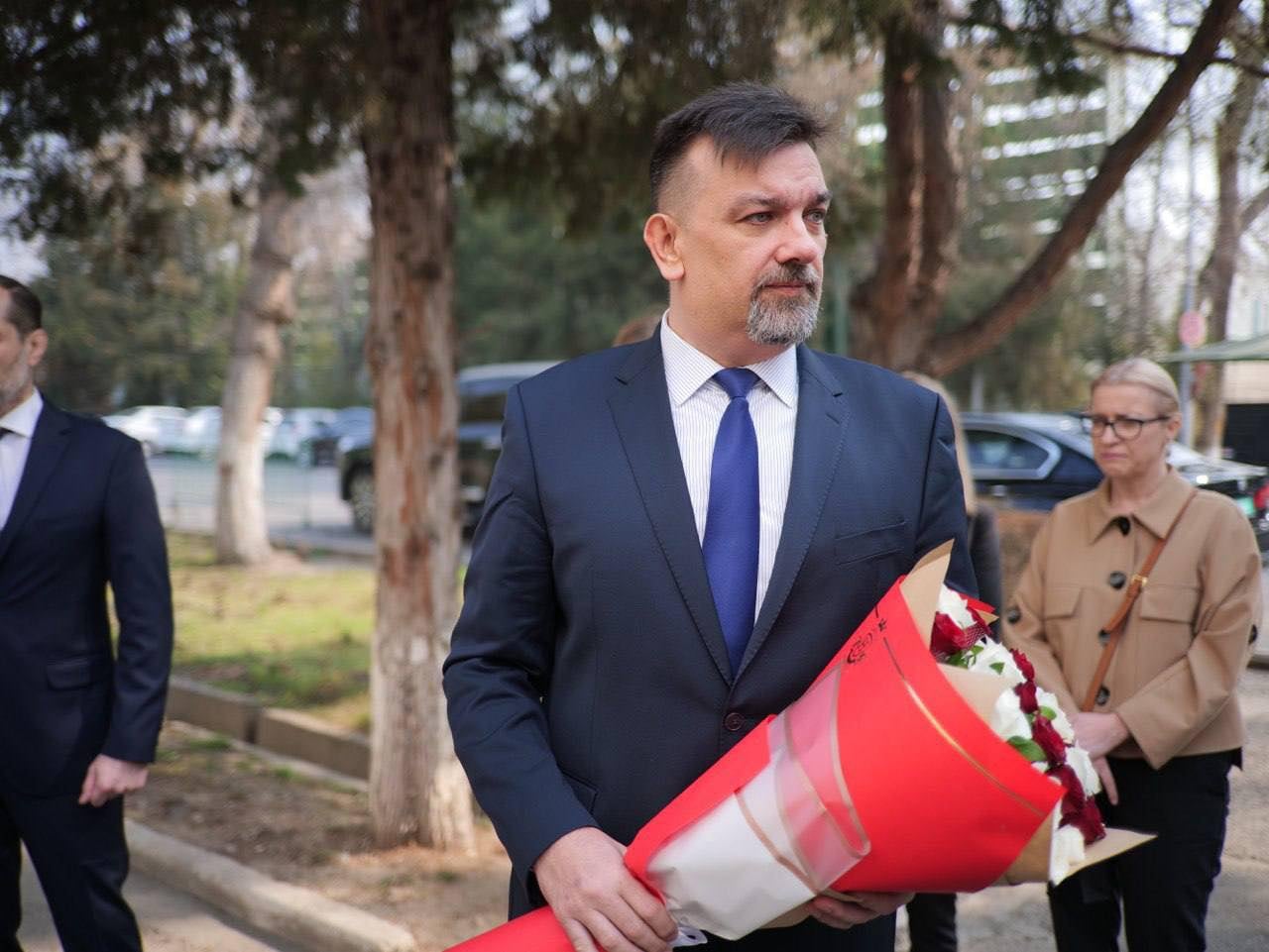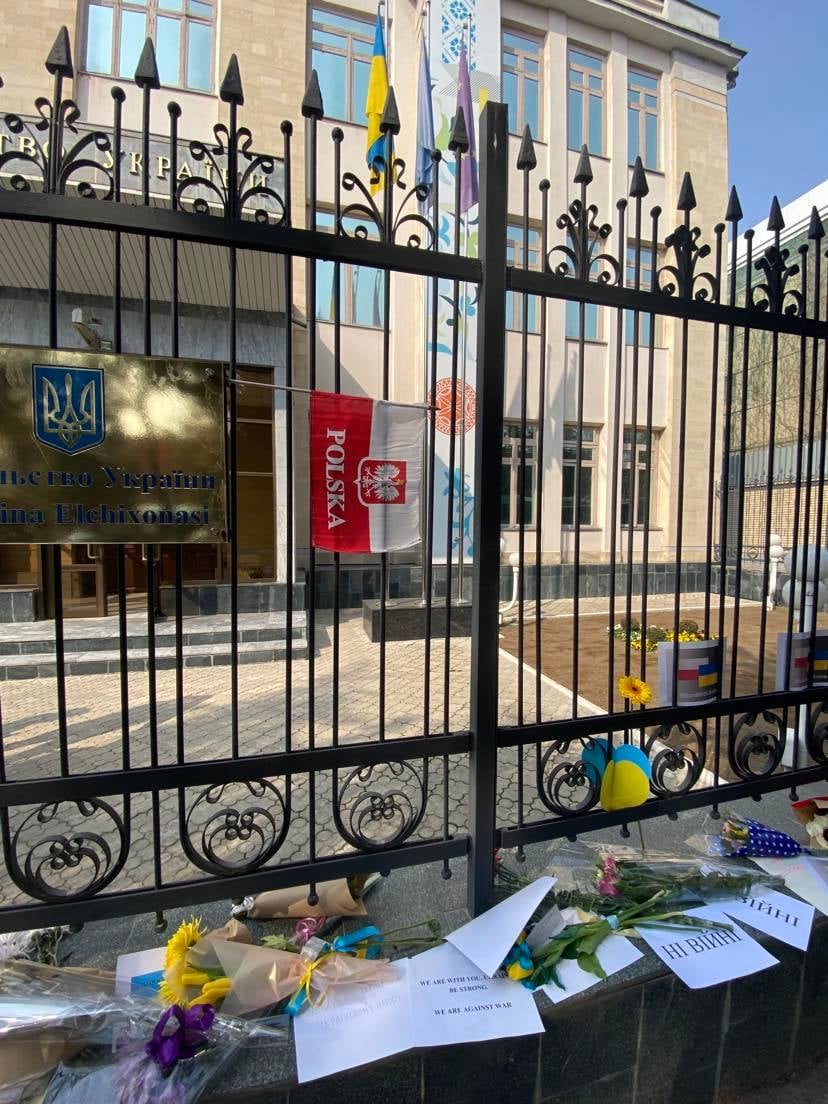 Dzisiaj w południe wszyscy pracownicy Ambasady Rzeczypospolitej Polskiej w Taszkencie na czele z Ambasadorem Radosławem Grukiem przybyli do Ambasady Ukrainy by wyrazić gest solidarności i wsparcia dla ukraińskiego narodu.