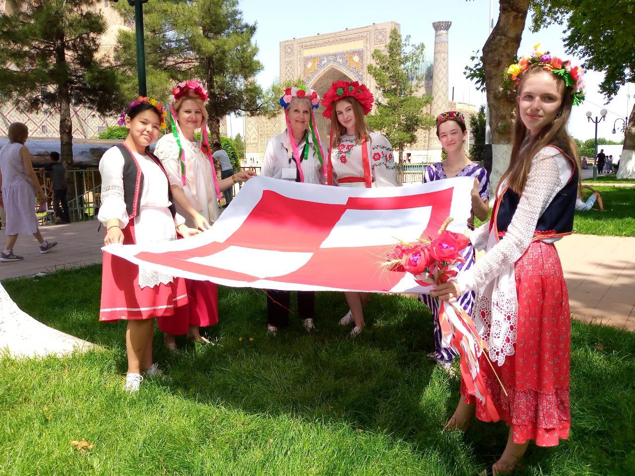 Dziewczęta ze stowarzyszenia polonijnego „Polonez” w Samarkandzie wraz z Paniami Tamarą Tatarenko i Natalią Tatarenko wykonały z biało-czerwonych tkanin logo obchodów Dni Polskiego Dziedzictwa Kulturowego.