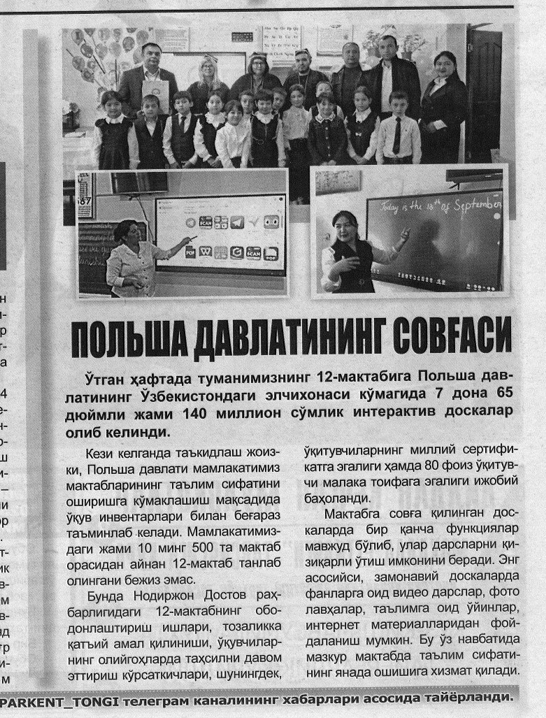 W ramach programu polskiej pomocy rozwojowej Ambasada RP w Taszkencie wyposażyła Szkołę nr 12 w miejscowości Hisorak w 7 tablic interaktywnych wartości 140 mln UZS. Wszystkie zostały oznaczone logotypem z napisem „Polska pomoc”. Jeszcze w trakcie realizacji projektu, szkołę odwiedziły przedstawicielki Departamentu Współpracy Rozwojowej Ministerstwa Spraw Zagranicznych RP: Magdalena Polak-Żołądkiewicz oraz Magdalena Sidorowicz – o czym napisała lokalna gazeta „Świt Parkentu”. W oficjalnym odsłonięciu projektu uczestniczył Marcin Wakar, Chargé d’affaires Rzeczpospolitej Polskiej w Uzbekistanie i Tadżykistanie.