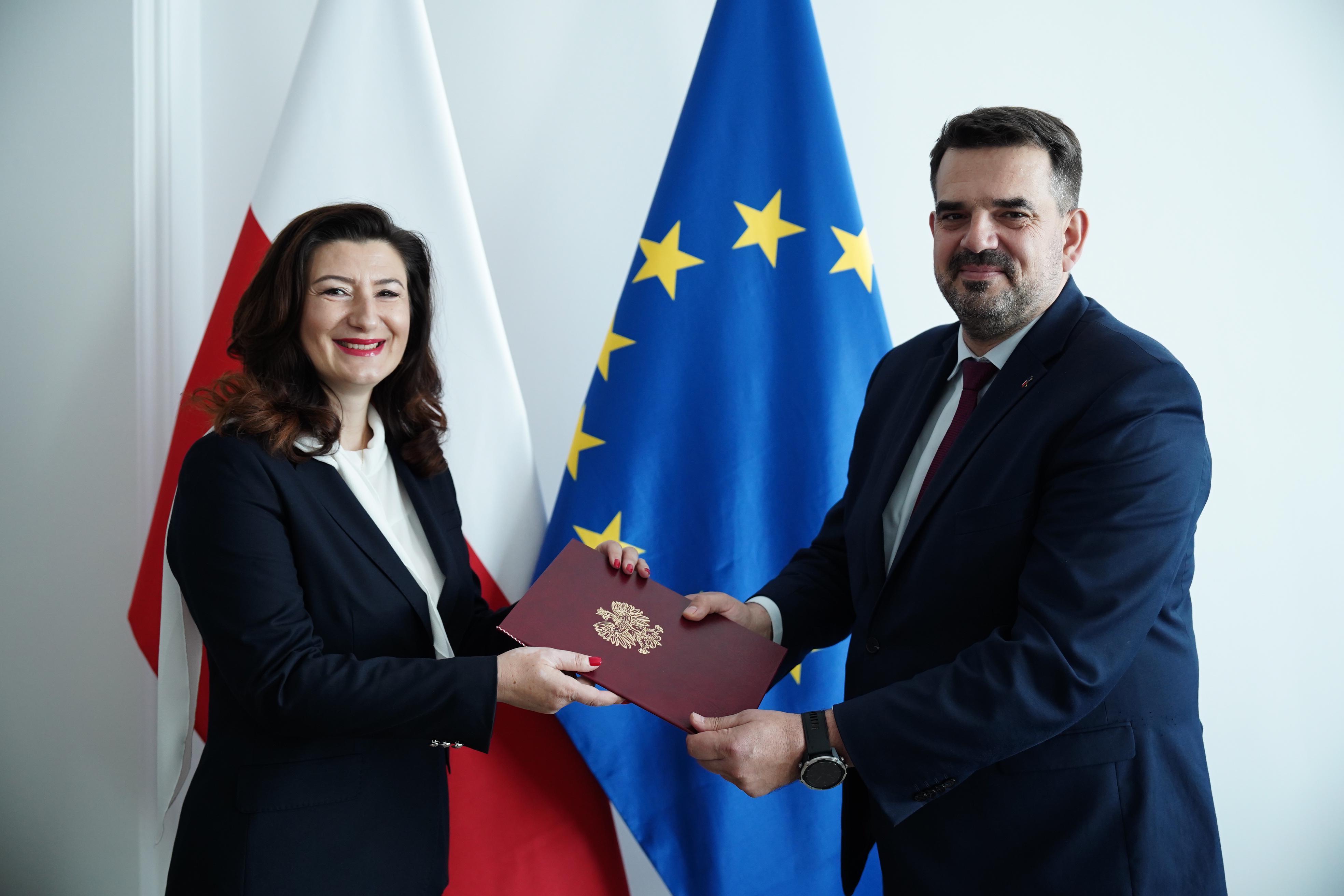 Wiceminister Jacek Tomczak wręczył dziś Agnieszce Olszewskiej akt powołania na stanowisko Prezesa Urzędu Zamówień Publicznych.