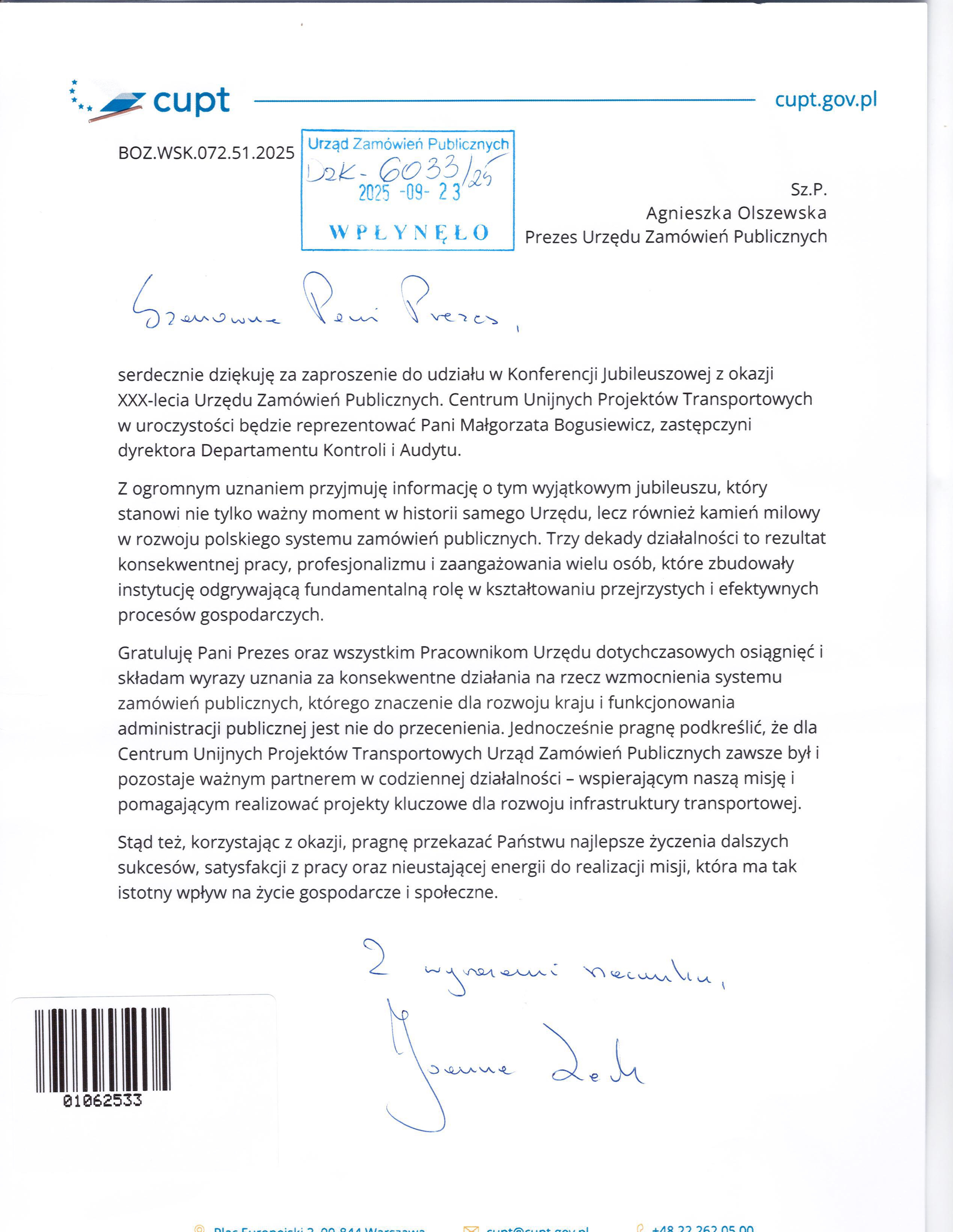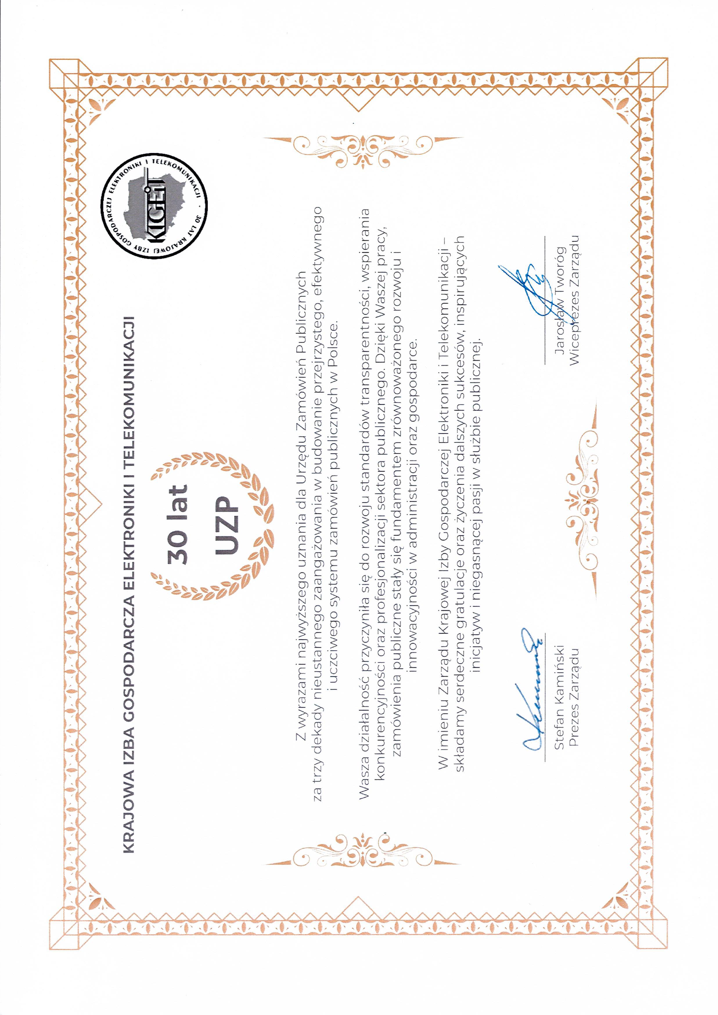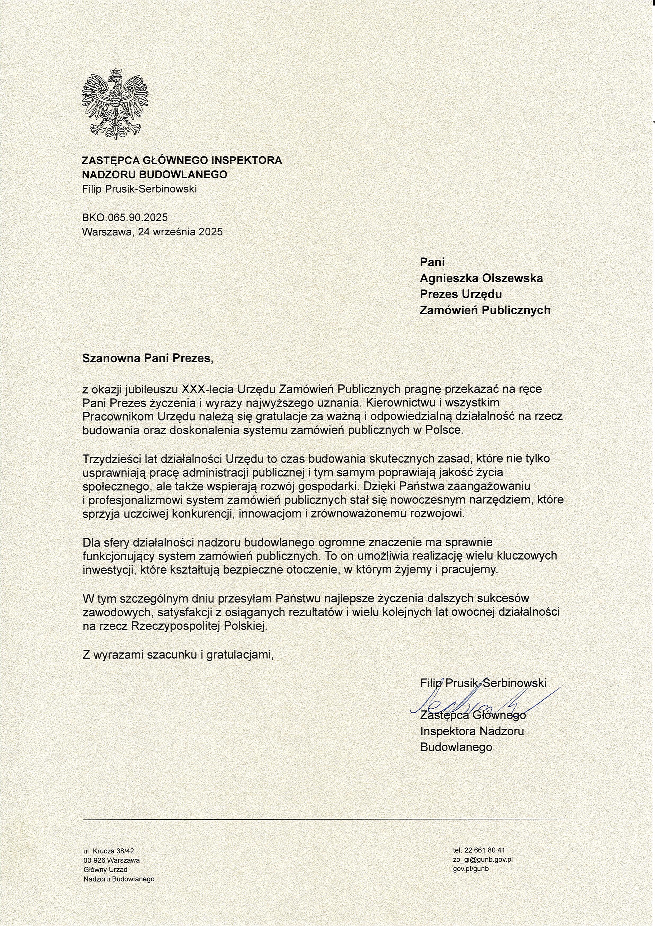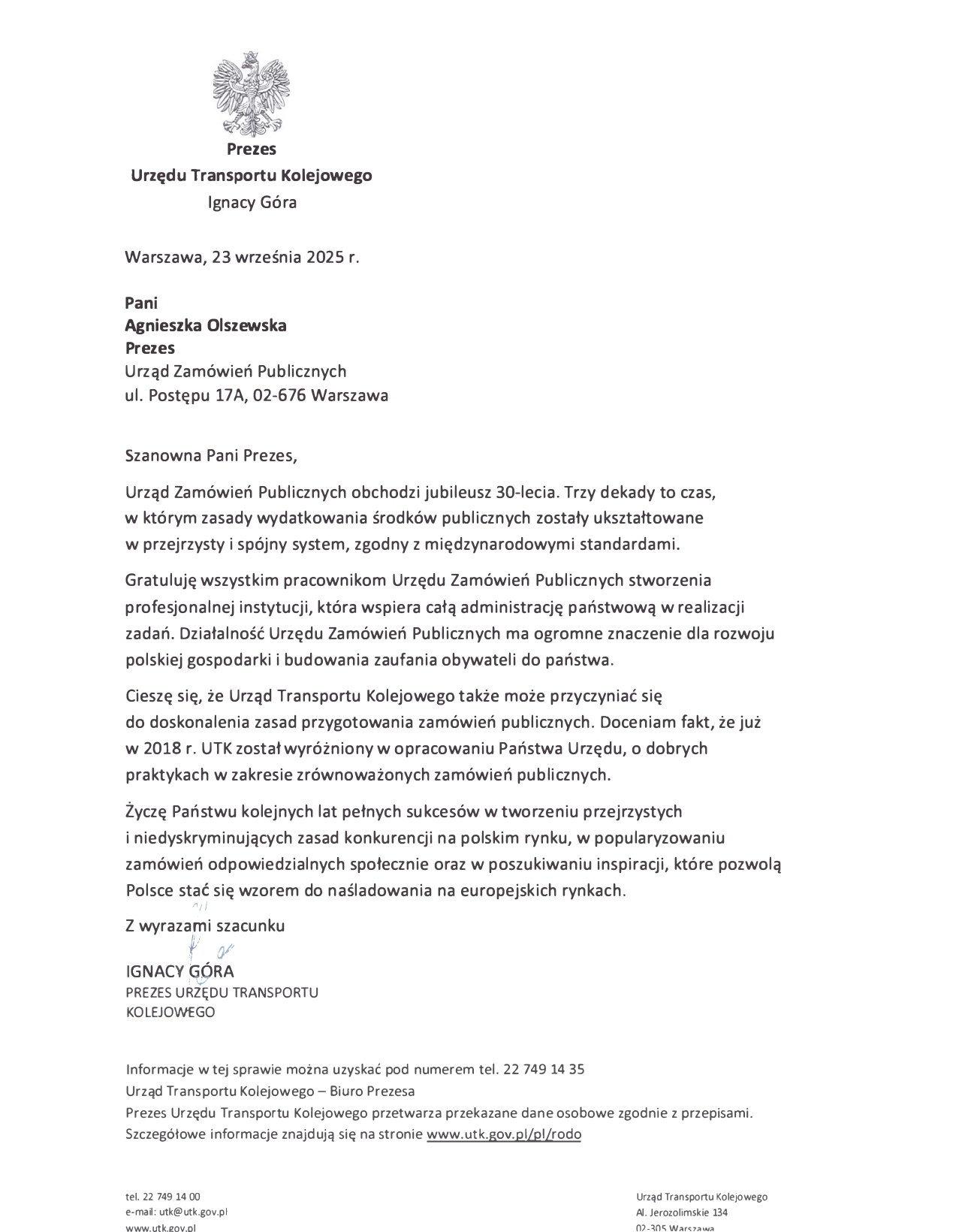 W Kancelarii Prezesa Rady Ministrów odbyła się Konferencja z okazji XXX-lecia Urzędu Zamówień Publicznych. Wydarzenie było okazją do podziękowania i uhonorowania pracowników Urzędu, którzy od trzech dekad z pasją i profesjonalizmem kształtują fundamenty systemu zamówień publicznych w Polsce. Była to również sposobność do nagrodzenia osób zaangażowanych w rozwój, edukację i promowanie zakupów publicznych wśród wszystkich uczestników rynku.