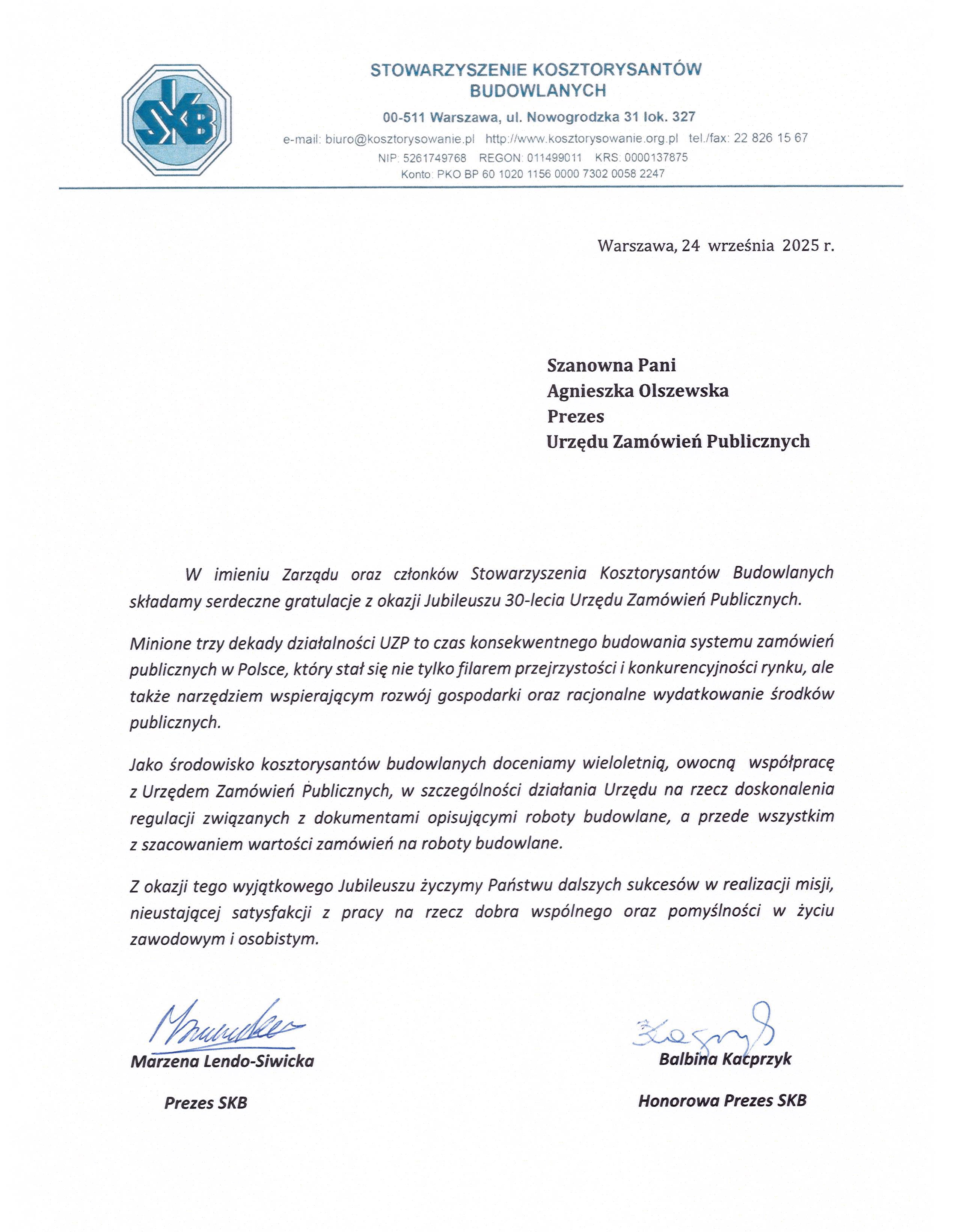 Gratulacje z okazji jubileuszu przekazało na ręce Pani Prezes szereg instytucji i organizacji. Zdjęcia części listów gratulacyjnych znajdują się w poniższej galerii.