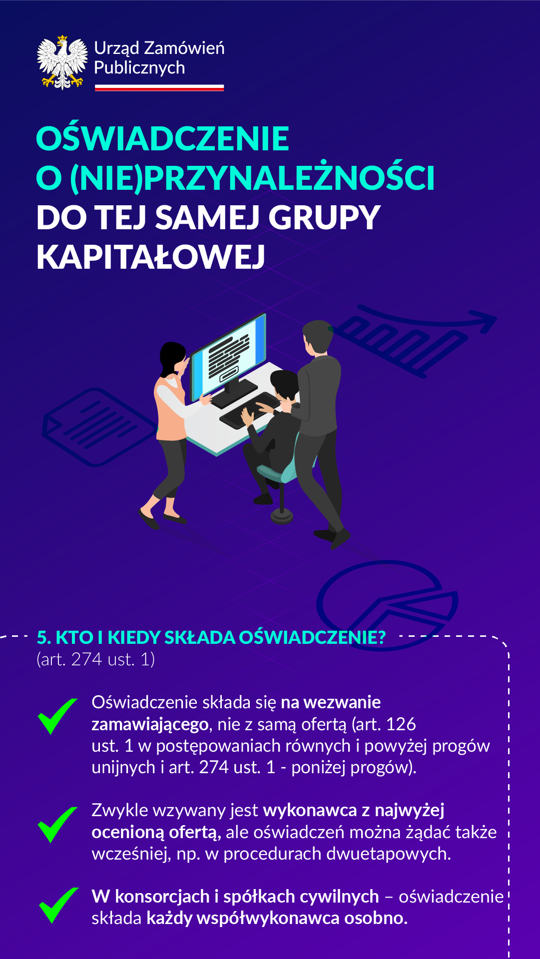 Grafiki odpowiadają na najważniejsze pytania - co rozumiemy przez tą samą grupę kapitałową, w jakim celu składa się takie oświadczenie, kiedy Zamawiający żąda takiego oświadczenia, co musi znaleźć się dokumencie, oraz kto, kiedy i w jaki sposó takie oświadczenie składa.