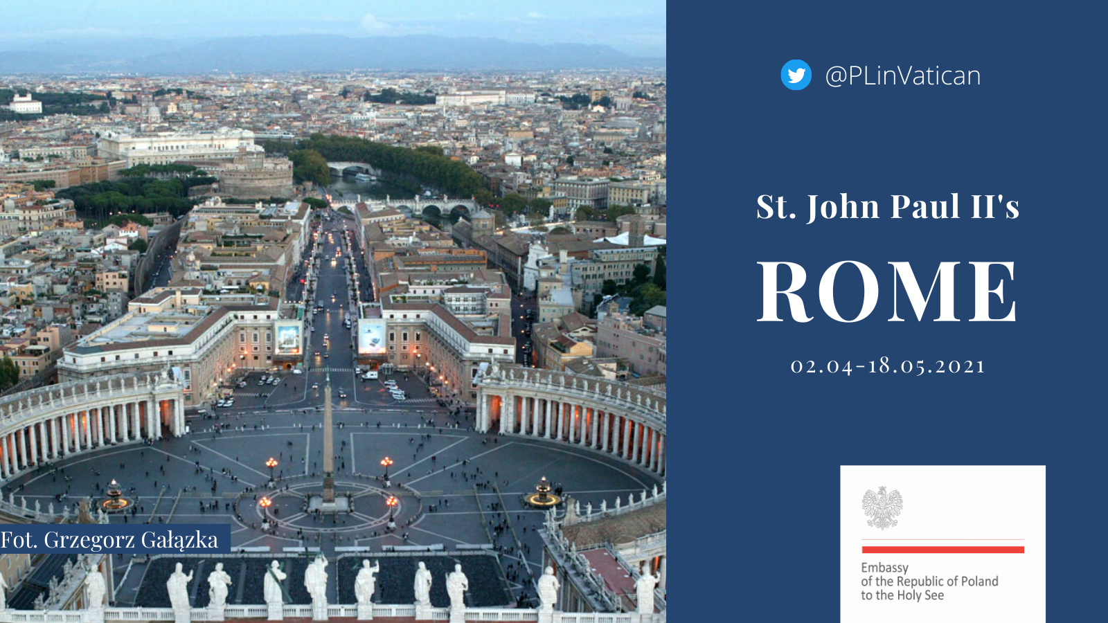 Dal 2 aprile al 18 maggio 2021 - l’anniversario della nascita di San Giovanni Paolo II, sull’account Twitter dell’Ambasciata, nell’ambito del progetto intitolato “Roma di San Giovanni Paolo II” pubblicheremo le foto dei luoghi di Roma legati a San Giovanni Paolo II. Vi invitiamo a seguirci su Twitter: https://twitter.com/PLinVatican