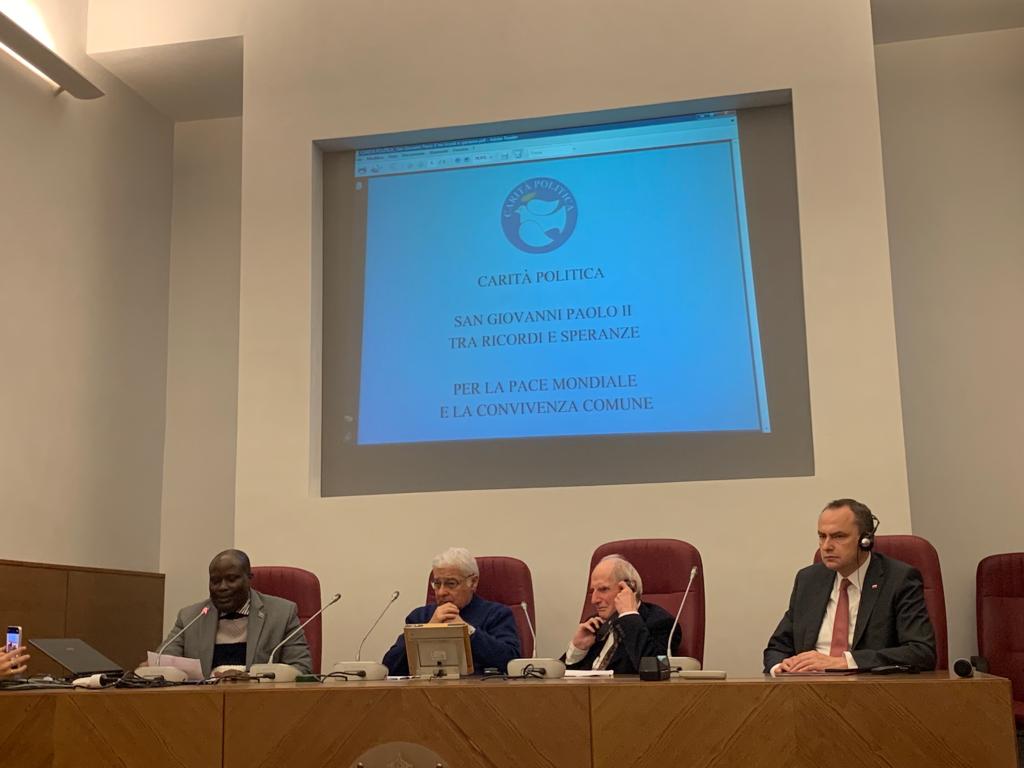 La conferenza si è tenuta nel Palazzo San Calisto a Roma. I lavori sono stati aperti dal Presidente e fondatore della Carità Politica prof. Alfredo Luciani. In seguito è intervenuto l’Ambasciatore di Polonia Adam Kwiatkowski, che nel suo discorso ha posto l’accento su alcuni aspetti del pontificato di Giovanni Paolo II quali l’impegno a favore della libertà religiosa e dignità umana, il dialogo interreligioso e il dialogo ecumenico, gli appelli per la pace e per il dialogo, indispensabile per risolvere conflitti politici. In seguito hanno preso parola gli ambasciatori di Ungheria, Repubblica Ceca, Albania, Marocco, Congo, Argentina, Cile, El Salvador e Guatemala. Ha coordinato e moderato l’incontro Don Wladimiro Bogogni Assistente Spirituale di Carità Politica per le Parrocchie di Roma.