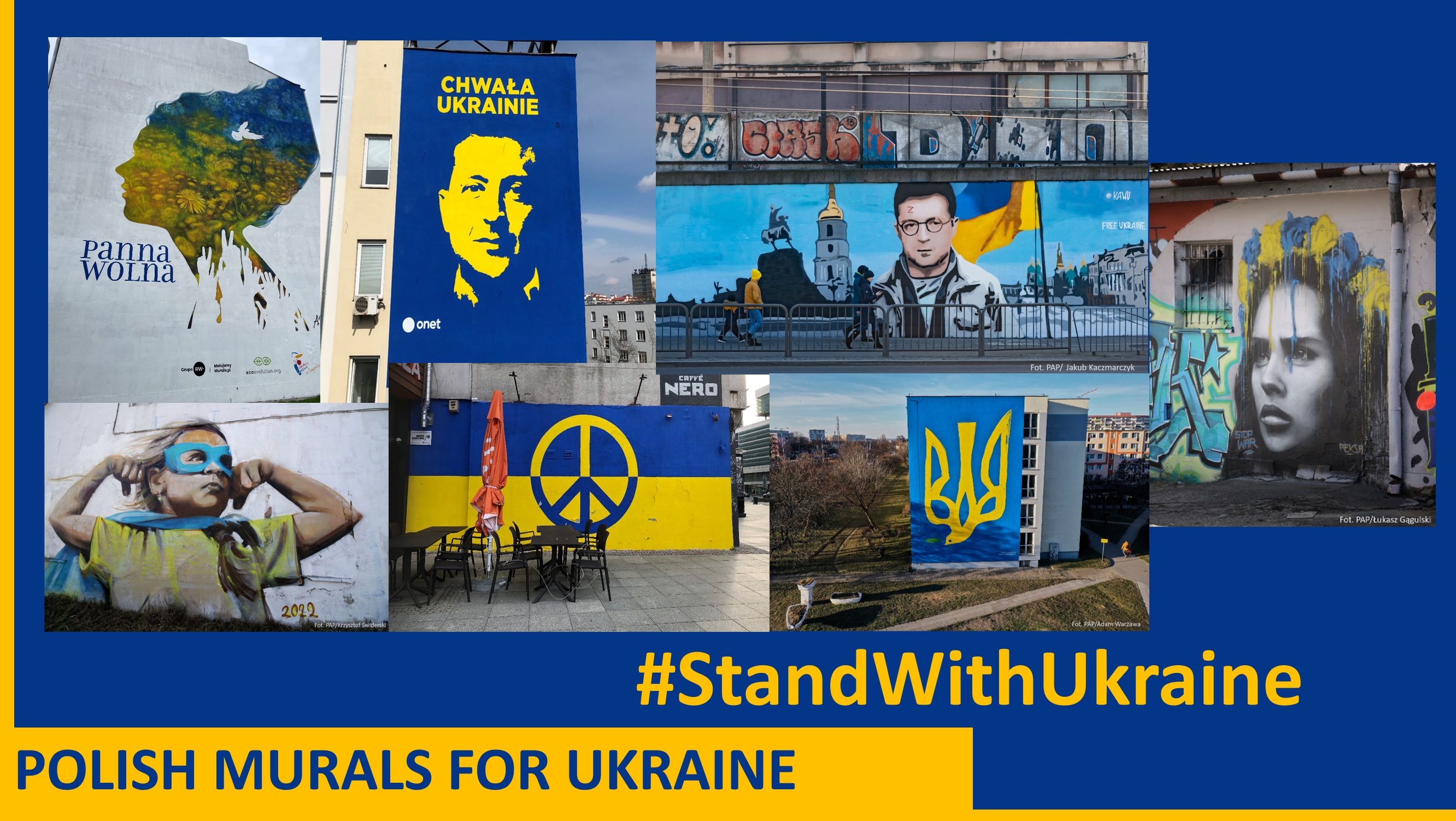 In occasione della Giornata Internazionale del Disegnatore presentiamo un collage di fotografie dei murales realizzati in Polonia nelle ultime settimane dagli artisti che hanno voluto esprimere la loro solidarietà con il popolo ucraino e protestare contro la guerra. Le foto dei murales provengono da varie città polacche: Varsavia, Cracovia, Poznań, Gdańsk, Kędzierzyn-Koźle.