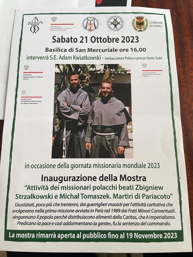 Il 21 ottobre 2023 nella Basilica di San Mercuriale di Forlì si è tenuta l’inaugurazione della mostra “Attività dei missionari polacchi beati Zbigniew Strzałkowski e Michał Tomaszek. Martiri di Pariacoto” dedicata ai frati francescani polacchi, uccisi a Pariacoto in Perù, e realizzata dall’Ambasciata di Polonia presso la Santa Sede.