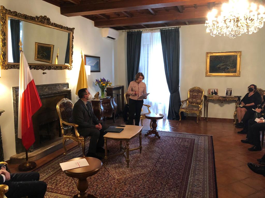 Gli ospiti sono stati accolti dall'Ambasciatore di Polonia Janusz Kotański. Nel suo intervento di benvenuto, l’Ambasciatore ha citato le parole di San Giovanni Paolo II pronunciate durante il suo viaggio apostolico in Ucraina nel 2001, sottolineando l'importanza di quel pellegrinaggio nel contesto politico dell'epoca. Ha parlato dell'impegno senza precedenti della Polonia nei confronti dei rifugiati provenienti dall’Ucraina, facendo presente che sul territorio polacco le persone fuggite dalla guerra in Ucraina non vengono ospitate nei campi profughi bensì nelle strutture rese disponibili dallo Stato, nelle case private e all’interno delle parrocchie. L'importanza del coinvolgimento della Polonia e di altri paesi vicini è stata sottolineata anche dall'Ambasciatore dell'Unione Europea, Alexandra Valkenburg, che ha guidato l'incontro con il capo della missione ucraina.