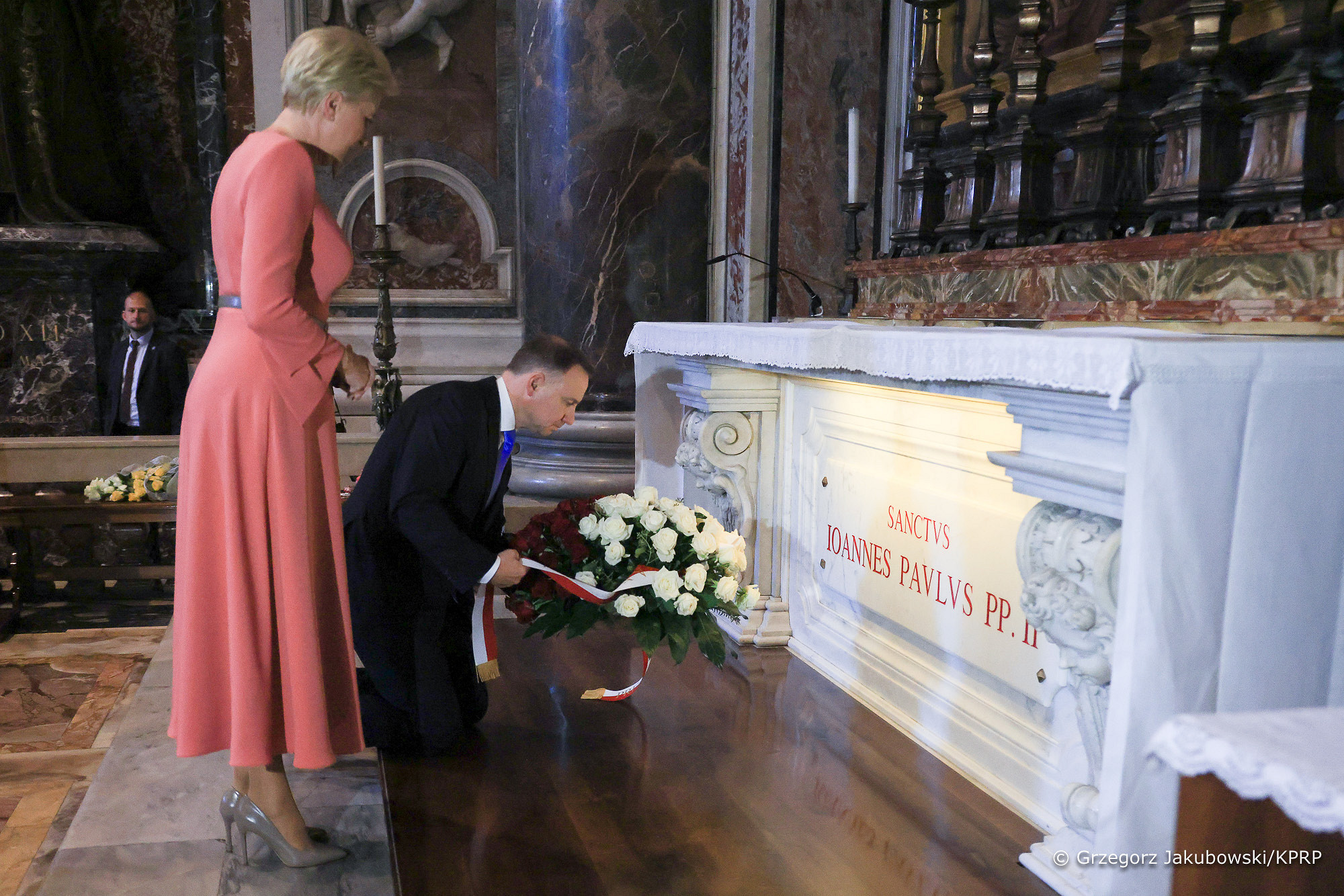 ll Presidente della Repubblica di Polonia Andrzej Duda, insieme alla Consorte Agata Kornhauser-Duda, ha deposto una corona di fiori sulla tomba di San Giovanni Paolo II nella Basilica di San Pietro in Vaticano nel giorno del 44° anniversario dell'elezione di Karol Wojtyła al soglio di Pietro.