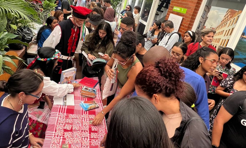 The Embassy of the Republic of Poland in Venezuela had a prominent presence with an open Polish language class, a talk dedicated to reading Polish poetry from Venezuela, and an informational stand about Poland. At this stand, the public could engage through a memory game featuring emblematic places in the country. As a symbolic element of the day, notebooks designed in the format of a Swiss passport were created, allowing attendees to collect representative stamps from each stand; the Polish stamp featured the figure of the Warsaw Mermaid (Warszawska Syrenka) alongside the expression “Dzień Dobry.” The Polish language was also included in the collective mural and in the storytelling area with the book Little Chopin.