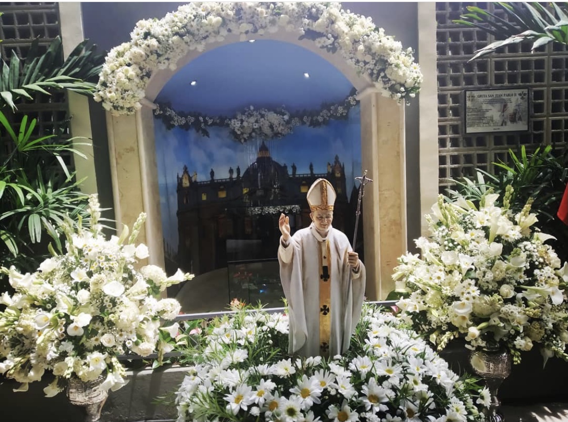 Acto seguido, fue entregada por la Embajada de la República de Polonia, en las manos de la Encargada de Negocios a.i., Milena Łukasiewicz, la figura del papa al Padre Francisco Javier Herrero, Rector del Colegio San Agustín El Paraíso, quien junto al Reverendísimo Nuncio Apostólico, Monseñor Aldo Gordiano, al Reverendísimo Cardenal, Baltazar Enrique Porras Cardoza y al Honorable Padre Nicanor Vivas, Vicario regional de los Agustinos, procedieron a bendecirla y a colocarla en la gruta.