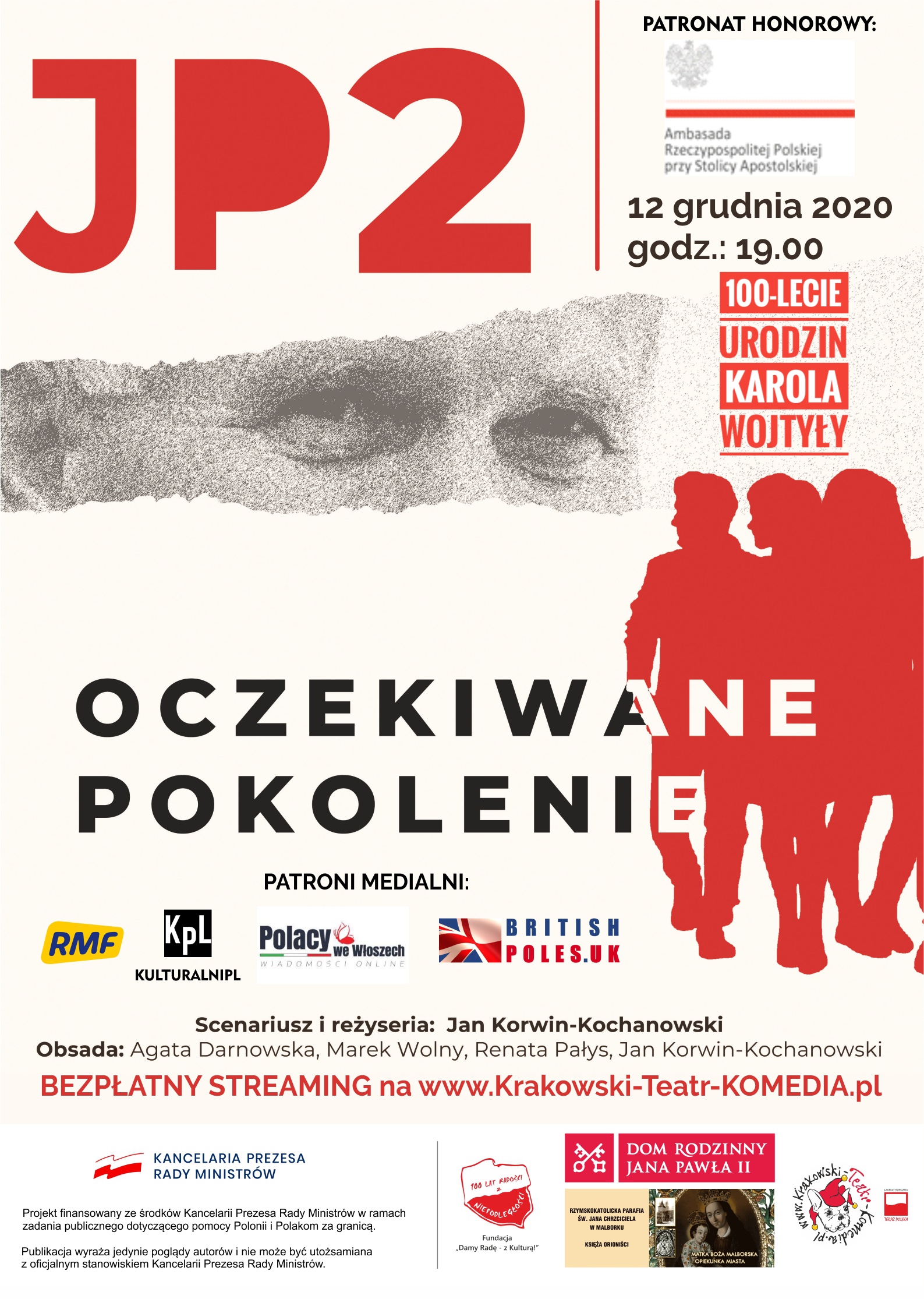 Zapraszamy do oglądania na żywo w dniu 12 grudnia 2020 spektaklu „JP2 - Oczekiwane Pokolenie” on-line z okazji 100-lecia urodzin Karola Wojtyły. Ambasador RP przy Stolicy Apostolskiej Janusz Kotański objął wydarzenie swoim patronatem.