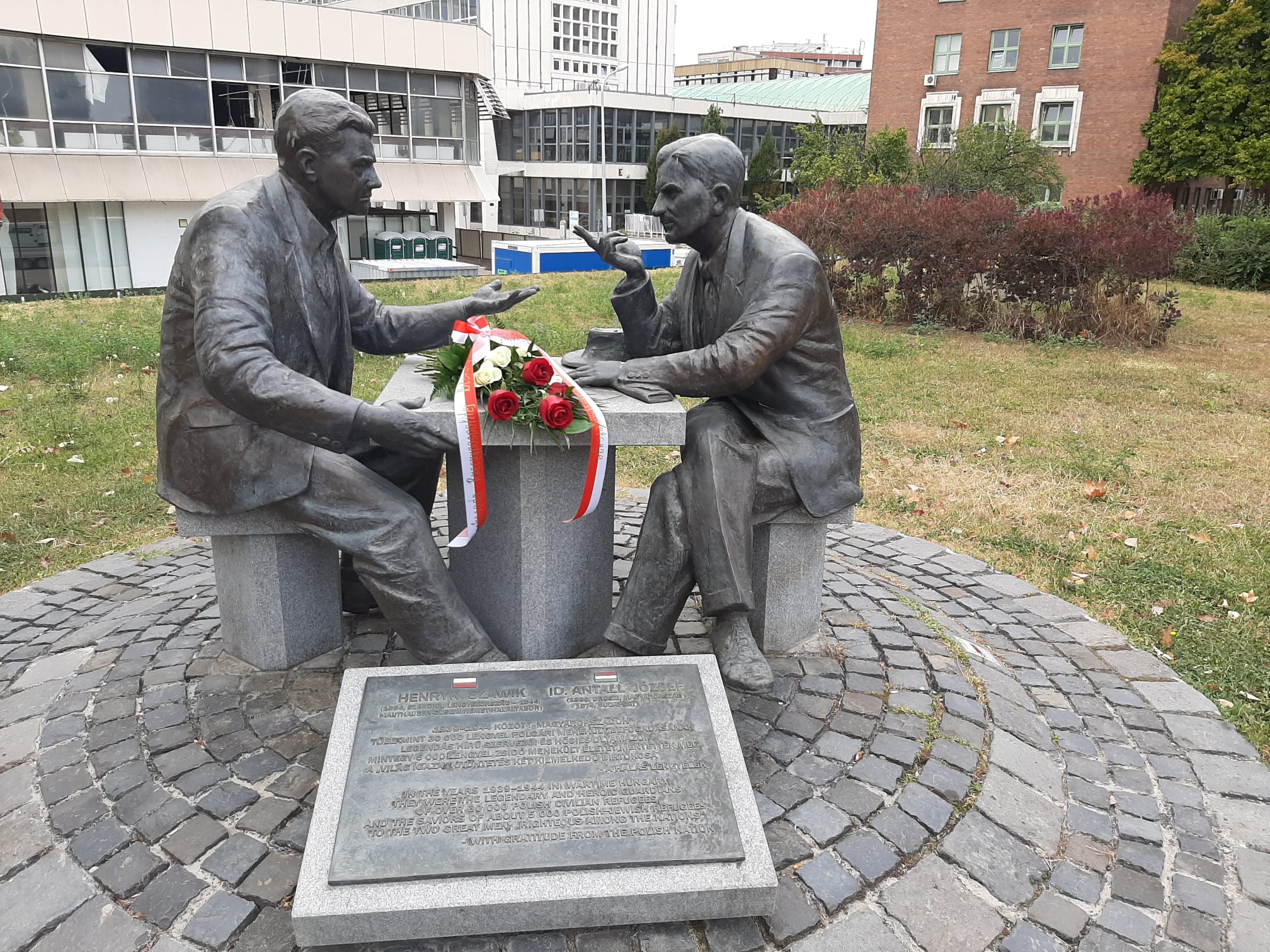 Symboliczną wiązankę kwiatów przy budapeszteńskim pomniku Henryka Sławika i Józsefa Antalla seniora, którzy pomagali uchodźcom w czasie II wojny światowej, złożyła w imieniu Ambasady kierownik WPE Katarzyna Ratajczak-Sowa.