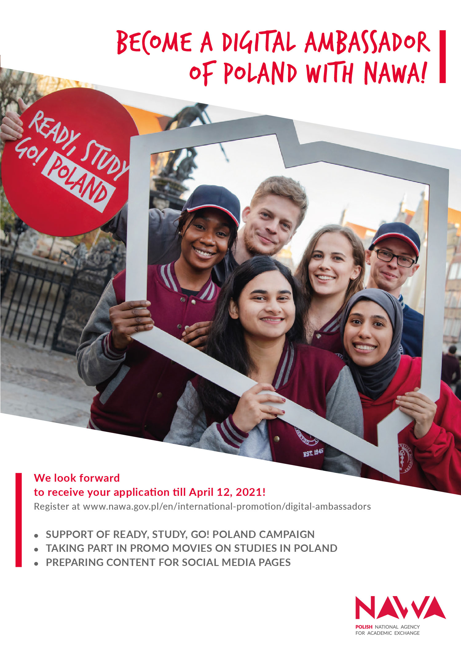 Wystartował drugi konkurs na Digital Ambasadorów NAWA! Szukamy osób, które studiują lub studiowały na Polskich uczelniach i które chcą nam wspierać przy promowaniu Polski online!
