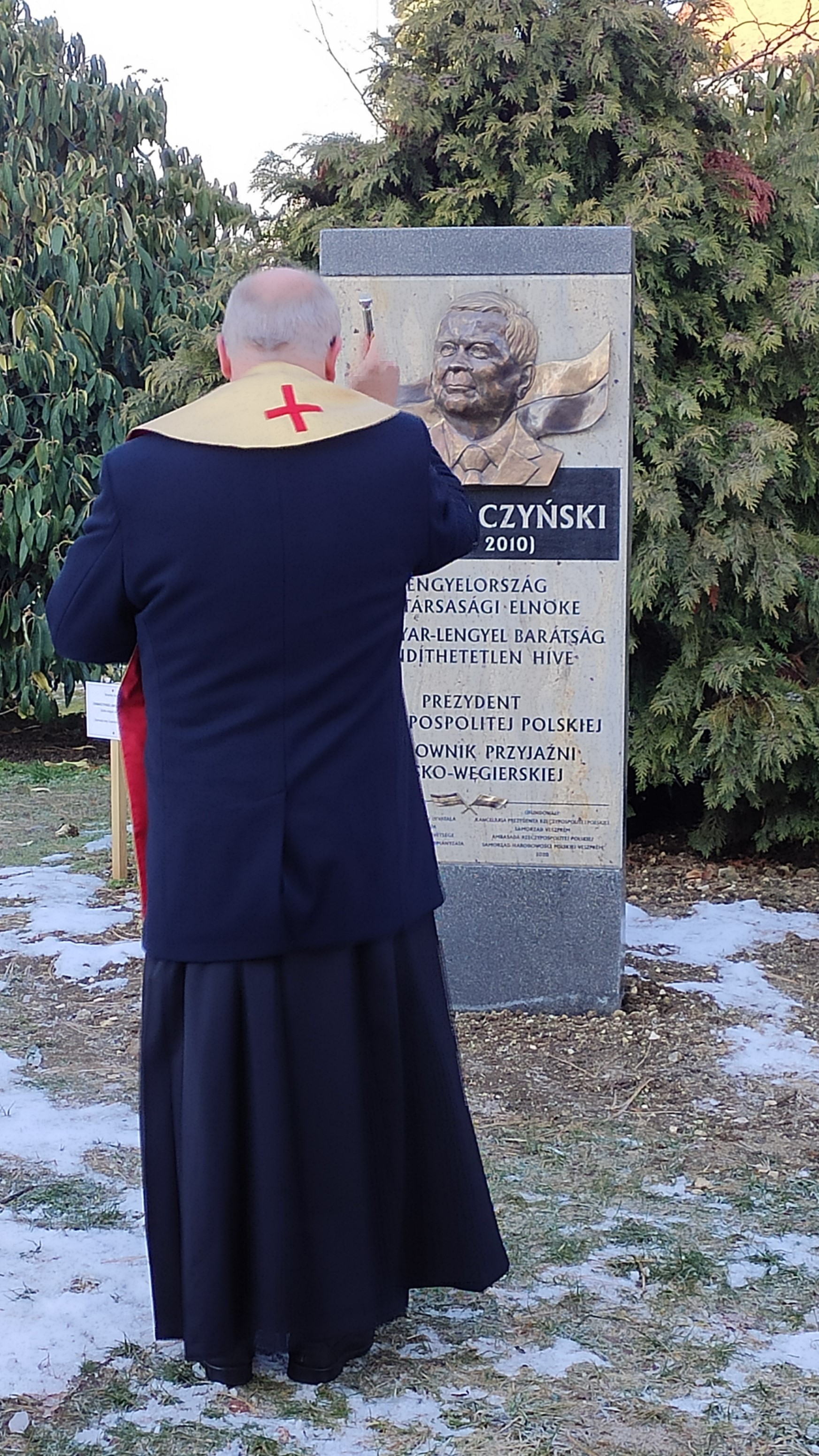 Po uroczystym odsłonięciu tablicy została ona poświęcona przez proboszcza parafii polskiej w Budapeszcie księdza Krzysztofa Grzelaka. Pod tablicą, w asyście żołnierzy węgierskiego i polskiego wojska wieńce złożyli: sekretarz stanu w KPRP Wojciech Kolarski, ambasador Jerzy Snopek, Zoltán Csallóközi, główny doradca wicepremiera Zsolta Semjéna, a także Prezydent Veszprém Gyula Porga oraz przewodnicząca Samorządu Narodowości Polskiej w Veszprém Hanna Kövesdi.