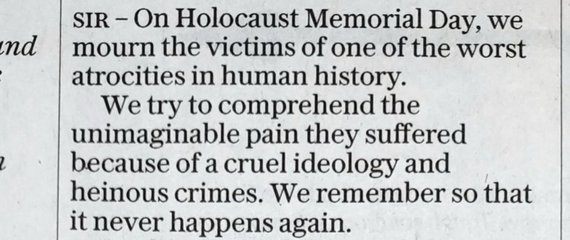 SIR – On Holocaust Memorial Day, we mourn the victims of one of the worst atrocities in human history.