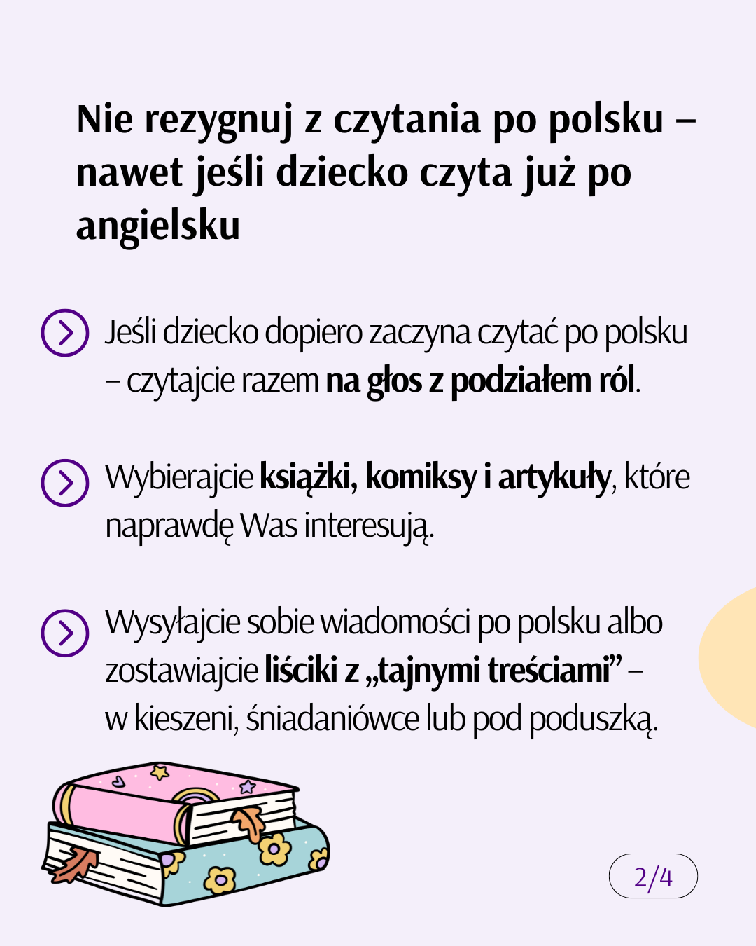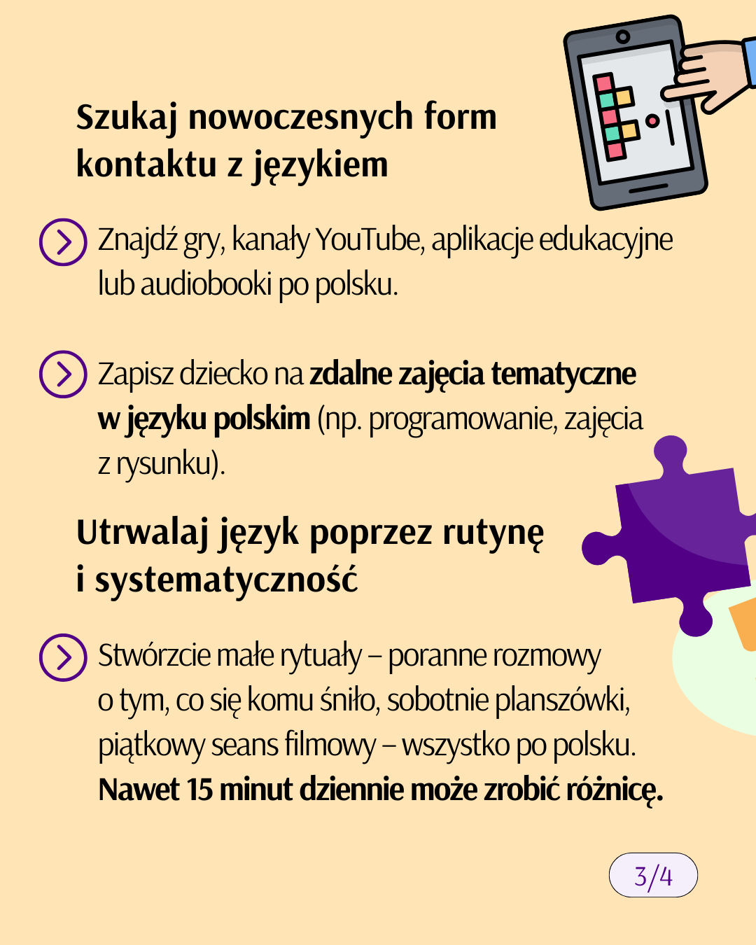 Język szkoły i rówieśników często staje się dla nich bardziej atrakcyjny. Co możesz zrobić, by język polski nadal był ważny w codzienności Twojego dziecka? W artykule oraz na grafikach załączonych poniżej znajdziesz kilka wskazówek jak uaktrakcyjnić język polski dla swoich dzieci.
