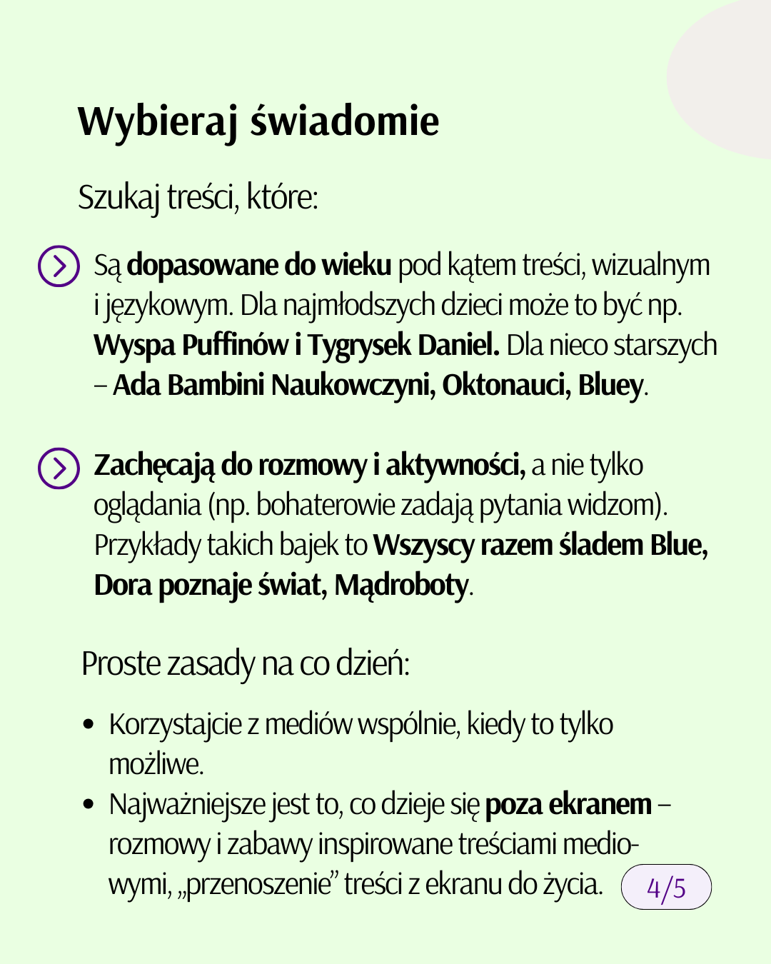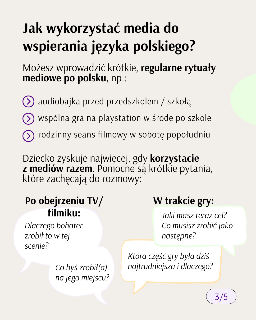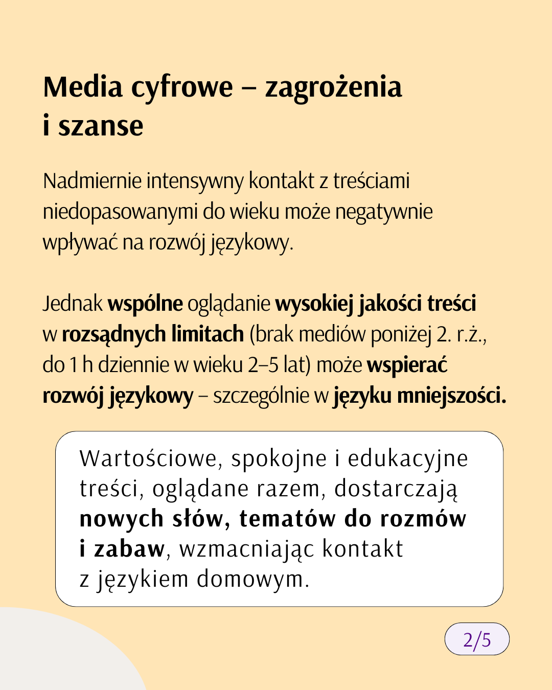 Dotyczy to szczególnie języka mniejszości, którego dziecko doświadcza na co dzień w mniejszym stopniu. Gdy treści są wartościowe, spokojne i edukacyjne, a dziecko korzysta z nich wspólnie z rodzicem lub rodzeństwem, media mogą stać się motywującym i atrakcyjnym sposobem na kontakt z językiem domowym, dostarczając nowych tematów do rozmów i zabaw oraz wprowadzając nowe słowa i frazy.