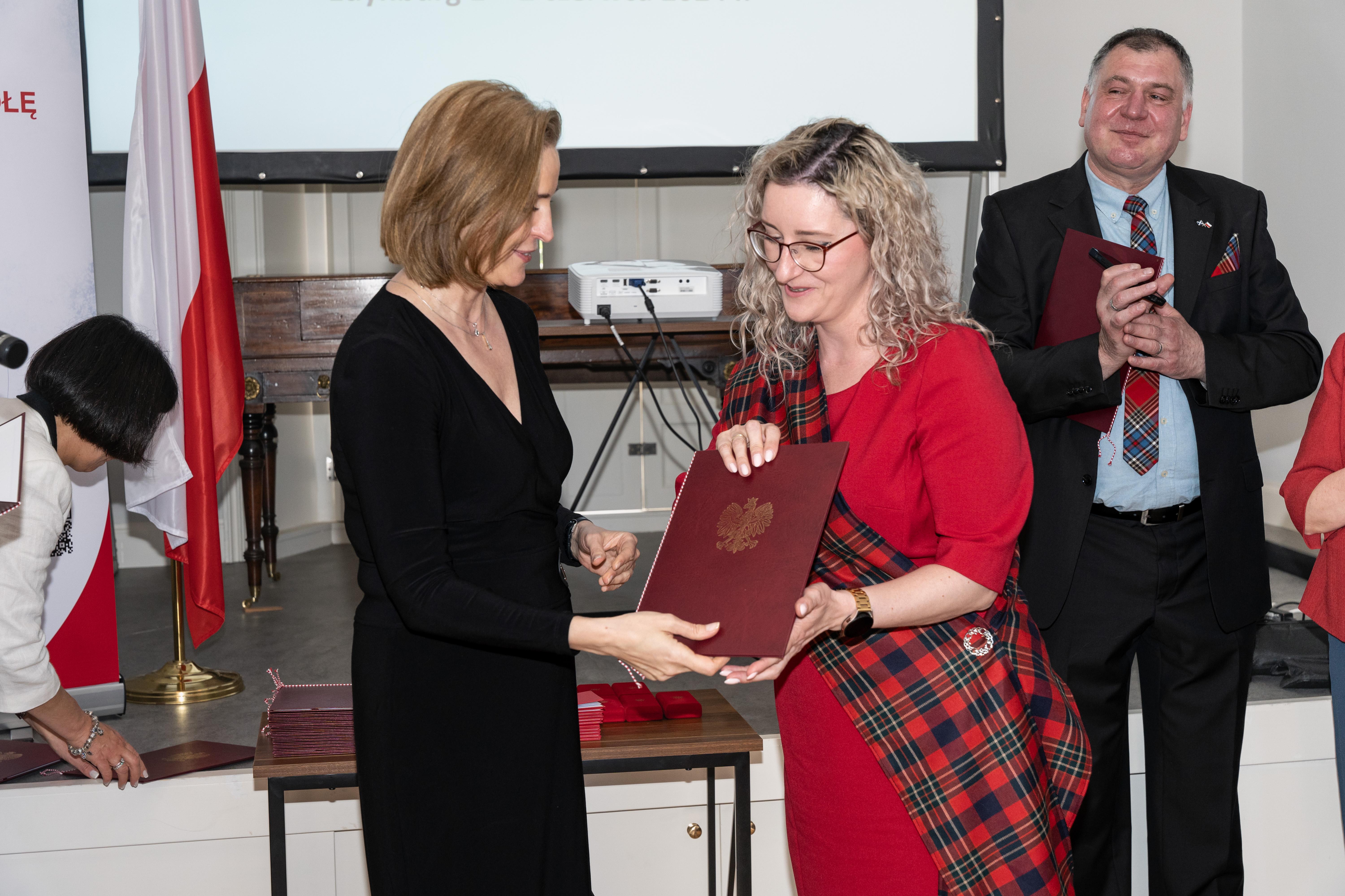 Po południu odbyło się spotkanie Ministry ze Stowarzyszeniem EDUS zrzeszającym wszystkie polskie szkoły w Szkocji, a jest ich obecnie 29, jak również z ich dyrektorami, którzy przybyli na spotkanie z całej Szkocji. Pani Joanna Mucha zapoznała się ze specyfiką edukacji polonijnej w tej części ZK, a następnie w Domu Polskim SPK w Edynburgu uroczyście wręczyła medale zasłużonym nauczycielom polonijnym.