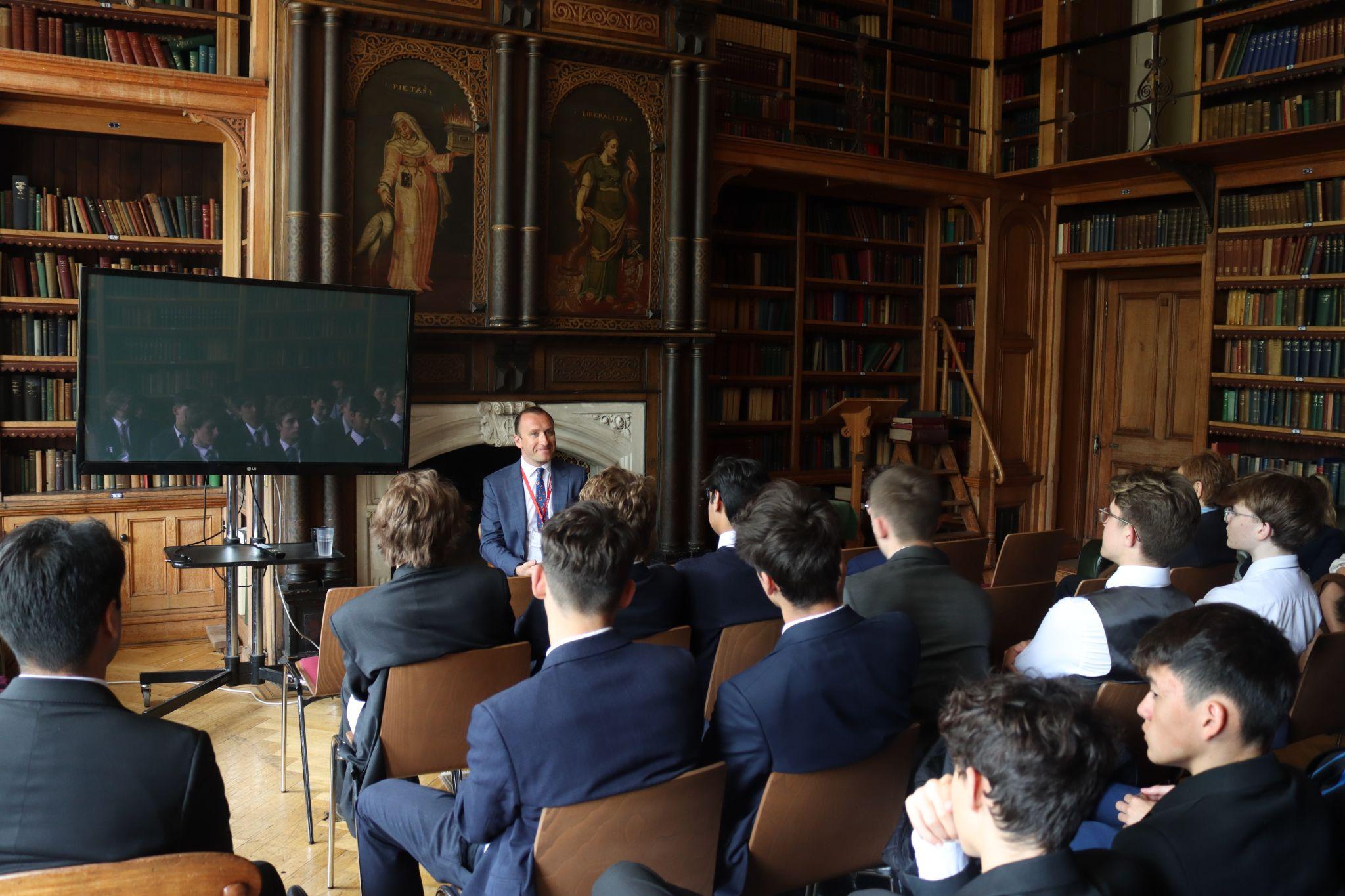 Po zwiedzeniu szkoły i odwiedzeniu archiwum College'u Bartosz Wiśniewski przeprowadził wykład dla uczniów związanych z Modern Languages i Politics Society. Mówił o polskiej społeczności w Wielkiej Brytanii i wpływie Brexitu na stosunki polsko-brytyjskie.