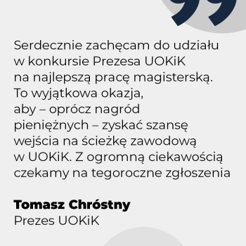 – Serdecznie zachęcam do udziału w konkursie Prezesa UOKiK na najlepszą pracę magisterską. To wyjątkowa okazja, aby – oprócz nagród pieniężnych – zyskać szansę wejścia na ścieżkę zawodową w UOKiK. Nasz konkurs od lat promuje prace nowatorskie, bogate we własne przemyślenia i odważne wnioski. Z ogromną ciekawością czekamy na tegoroczne zgłoszenia – mówi Prezes UOKiK Tomasz Chróstny.