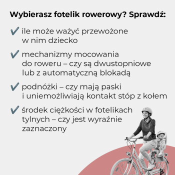 - Kupujesz fotelik? Sprawdź: limit wagi dziecka, mechanizmy mocowania do roweru, ochronę stóp przez podnóżki. Dowiedz się więcej z raportu.