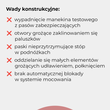 - Przykłady: wypadnięcie manekinów testowych z pasów bezpieczeństwa, otwory i paski grożące zaklinowaniem się paluszków lub wkręceniem stóp.