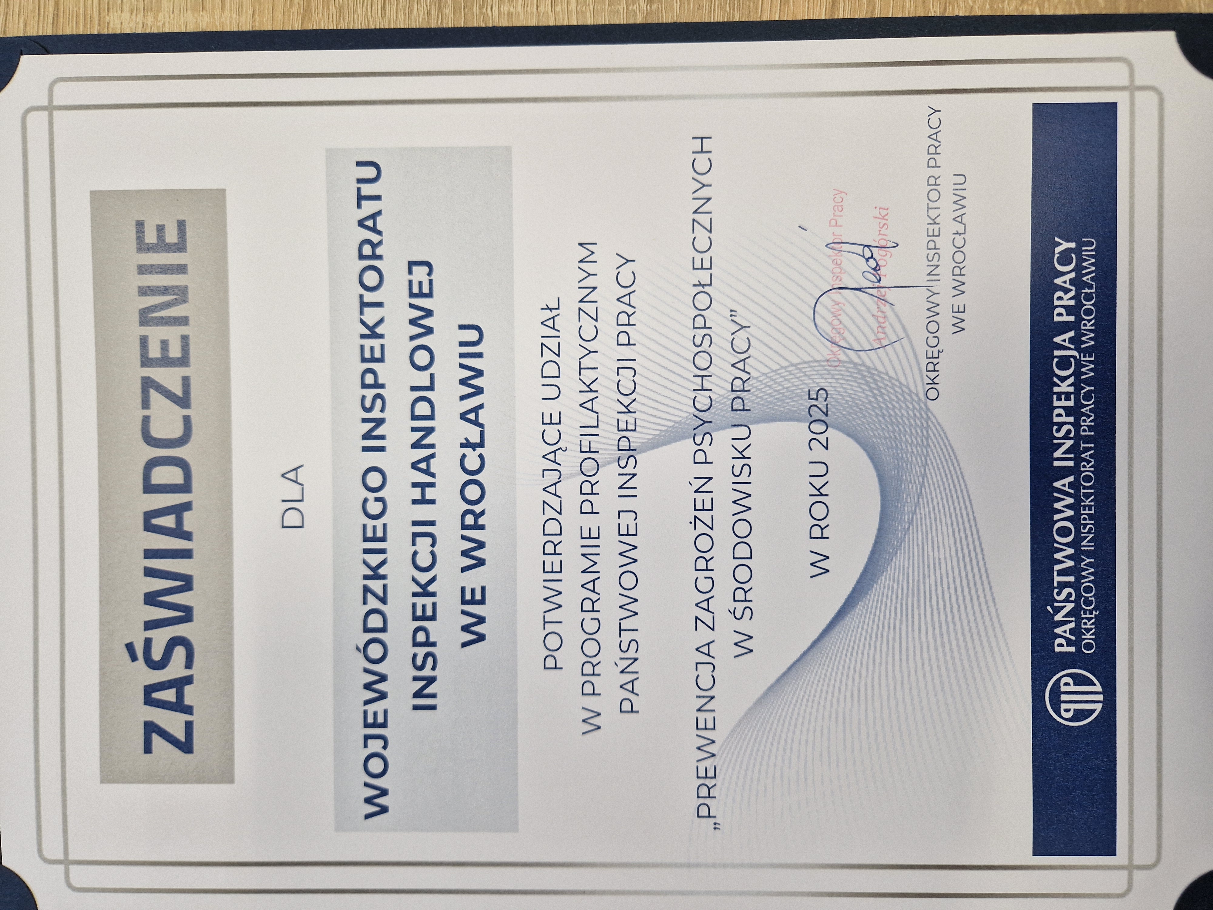 Podczas gali Dolnośląski Wojewódzki Inspektorat Inspekcji Handlowej odebrał oficjalne zaświadczenie potwierdzające udział w programie „Prewencja zagrożeń psychospołecznych w środowisku pracy”.