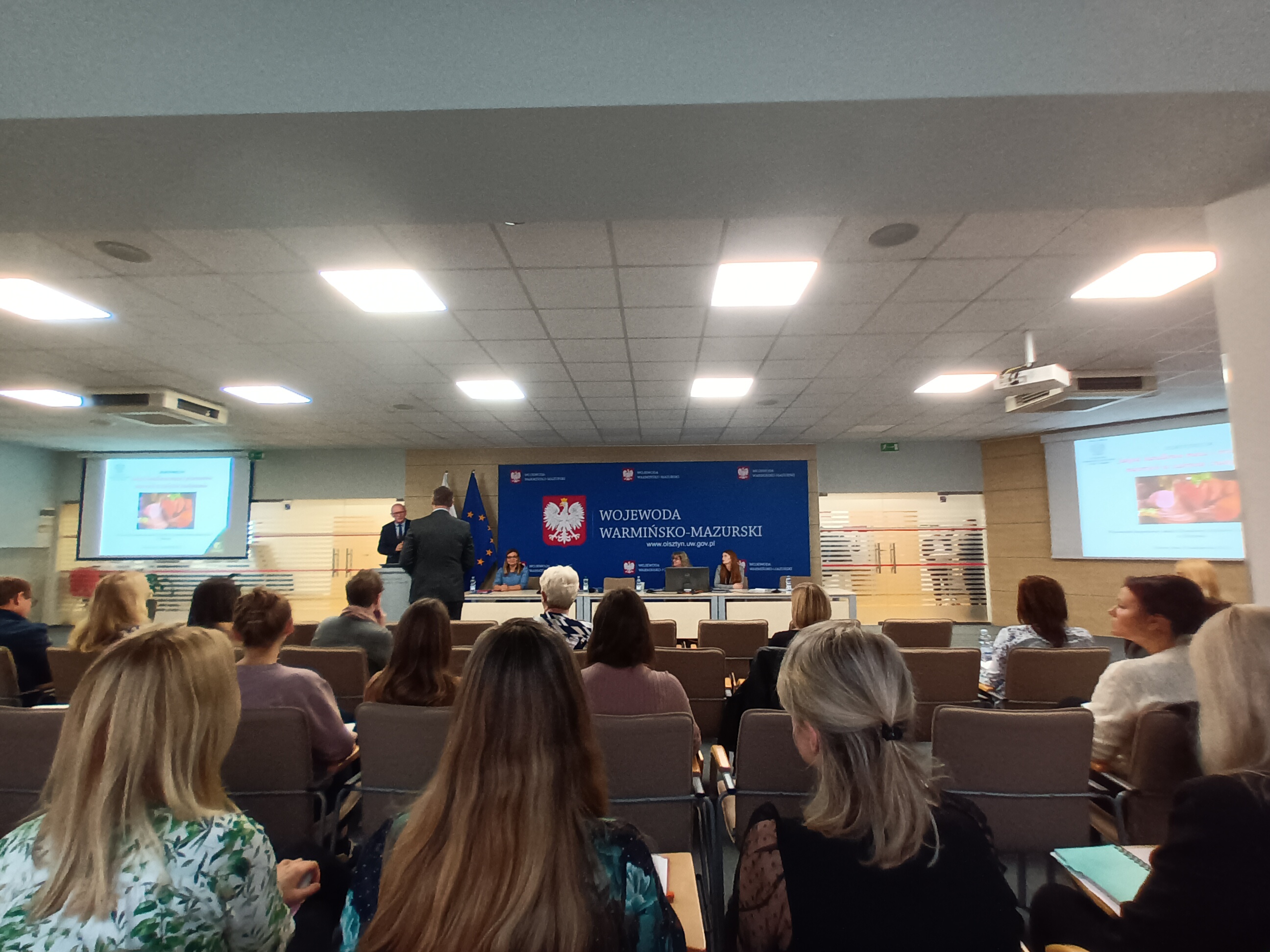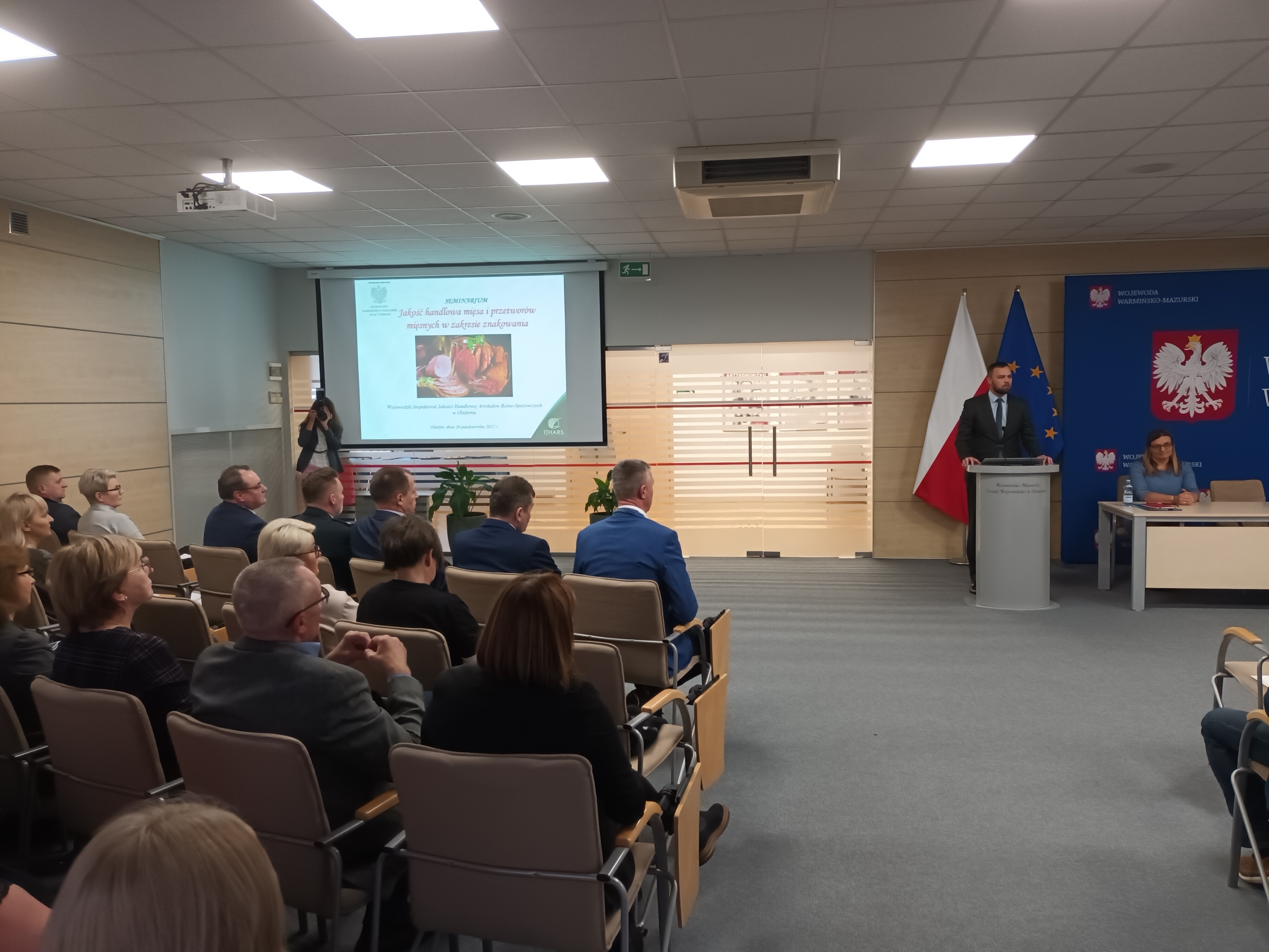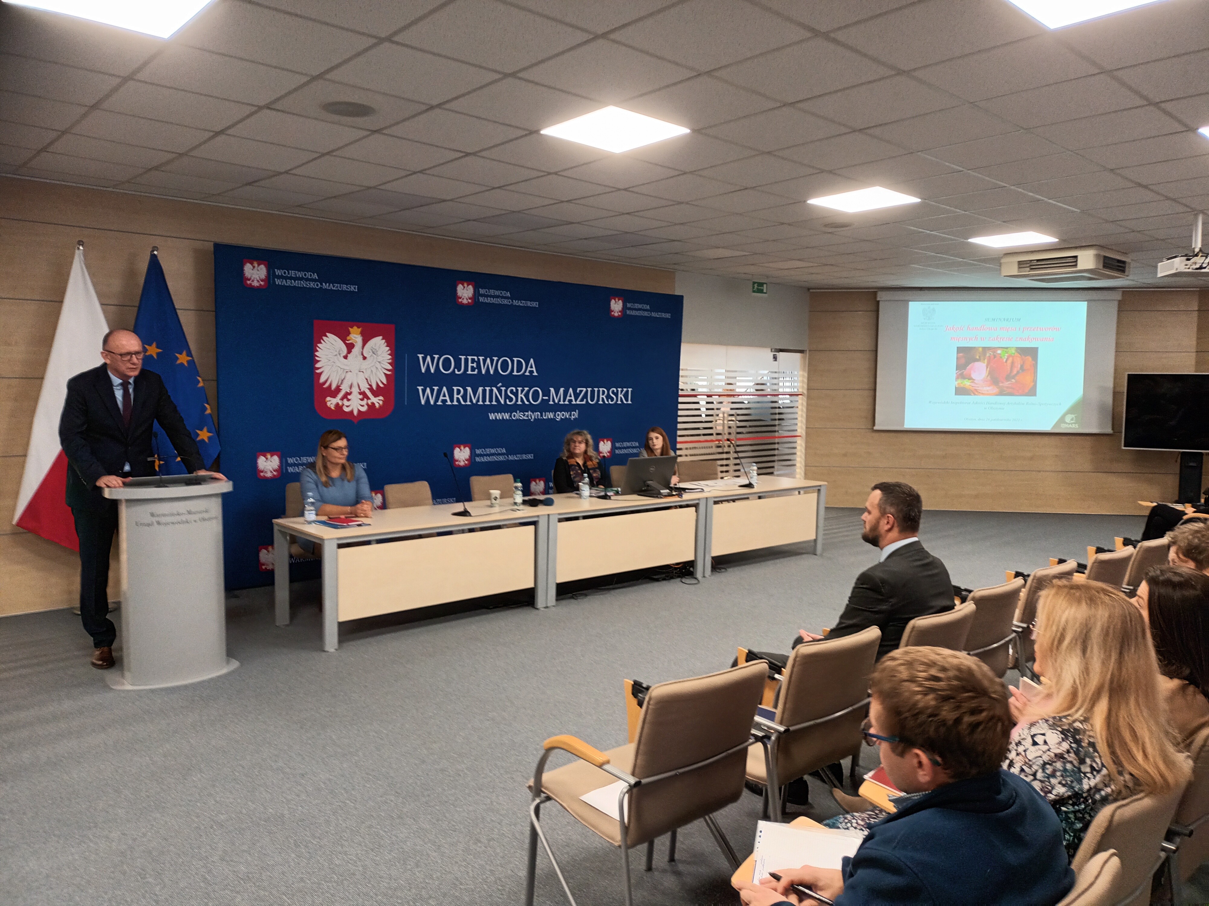 Dnia 26 października 2022 r. w Warmińsko-Mazurskim Urzędzie Wojewódzkim odbyło się seminarium objęte honorowym patronatem Wojewody Warmińsko-Mazurskiego w temacie „Jakość handlowa mięsa i przetworów mięsnych w zakresie znakowania”. Seminarium skierowane było do lokalnych producentów prowadzących działalność produkcyjną w branży mięsnej zarówno w obszarze rolniczego handlu detalicznego, produkcji marginalnej, lokalnej i ograniczonej jak i producentów prowadzących działalność ogólnokrajową oraz podmiotów wprowadzających do obrotu mięso i przetwory mięsne. Spotkało się ono z dużym zainteresowaniem ze strony producentów o czym świadczy duża liczba osób zgłaszających chęć udziału w spotkaniu. W szkoleniu wzięło udział ponad 100 uczestników. Wśród zaproszonych gości był Wicewojewoda Warmińsko-Mazurski Pan Piotr Opaczewski, przedstawiciele Warmińsko-Mazurskiej Inspekcji Jakości Handlowej, Inspekcji Weterynaryjnej, Inspekcji Sanitarno-Epidemiologicznej, Agencji Modernizacji i Restrukturyzacji Rolnictwa, Krajowego Ośrodka Wsparcia Rolnictwa oraz Warmińsko-Mazurskiego Ośrodka Doradztwa Rolniczego.