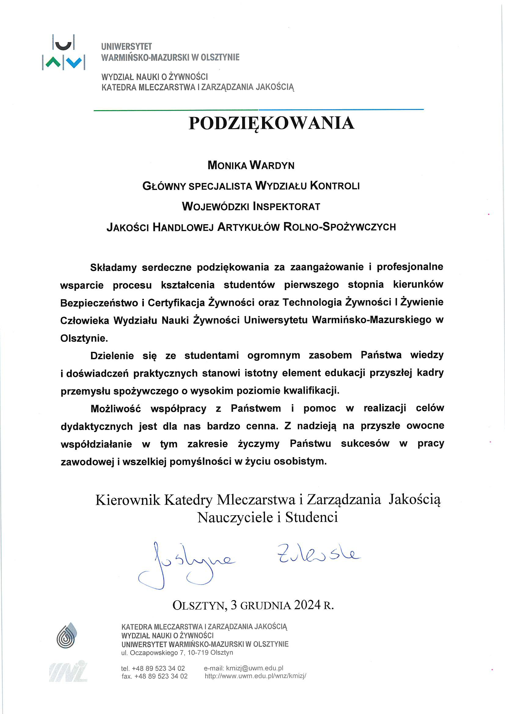 Na koniec na ręce przedstawiciela WIJHARS w Olsztynie złożono pisemne podziękowania za zaangażowanie i profesjonalne wsparcie procesu kształcenia studentów.