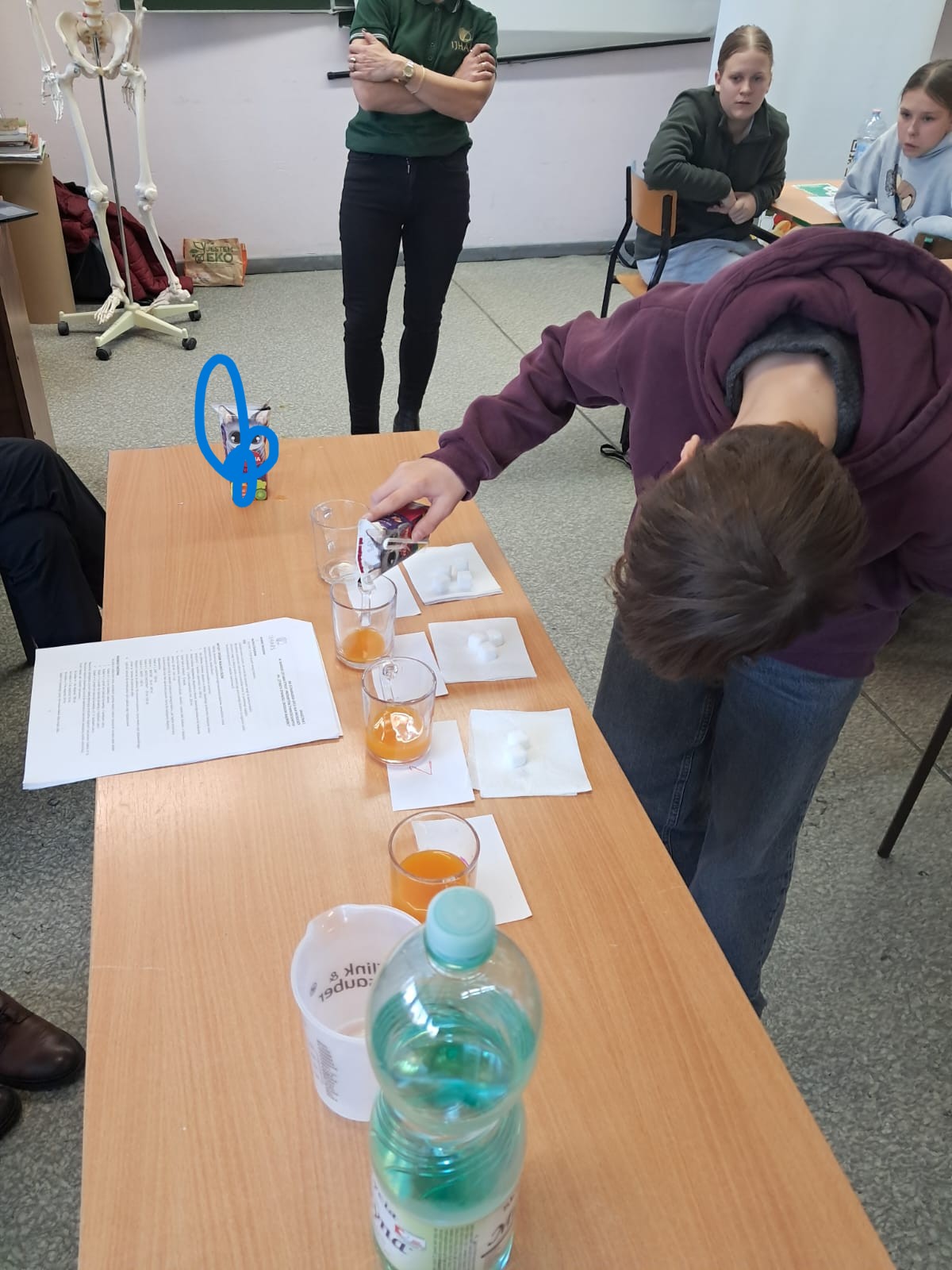 Dużym zainteresowaniem cieszyło się praktyczne doświadczenie, w którym uczestnicy mogli porównać różnice pomiędzy sokiem, nektarem, napojem owocowym oraz zwykłym napojem. Uczniowie z zaciekawieniem analizowali zawartość poszczególnych produktów i uczyli się, jak te różnice wpływają na ich jakość i wartość odżywczą.