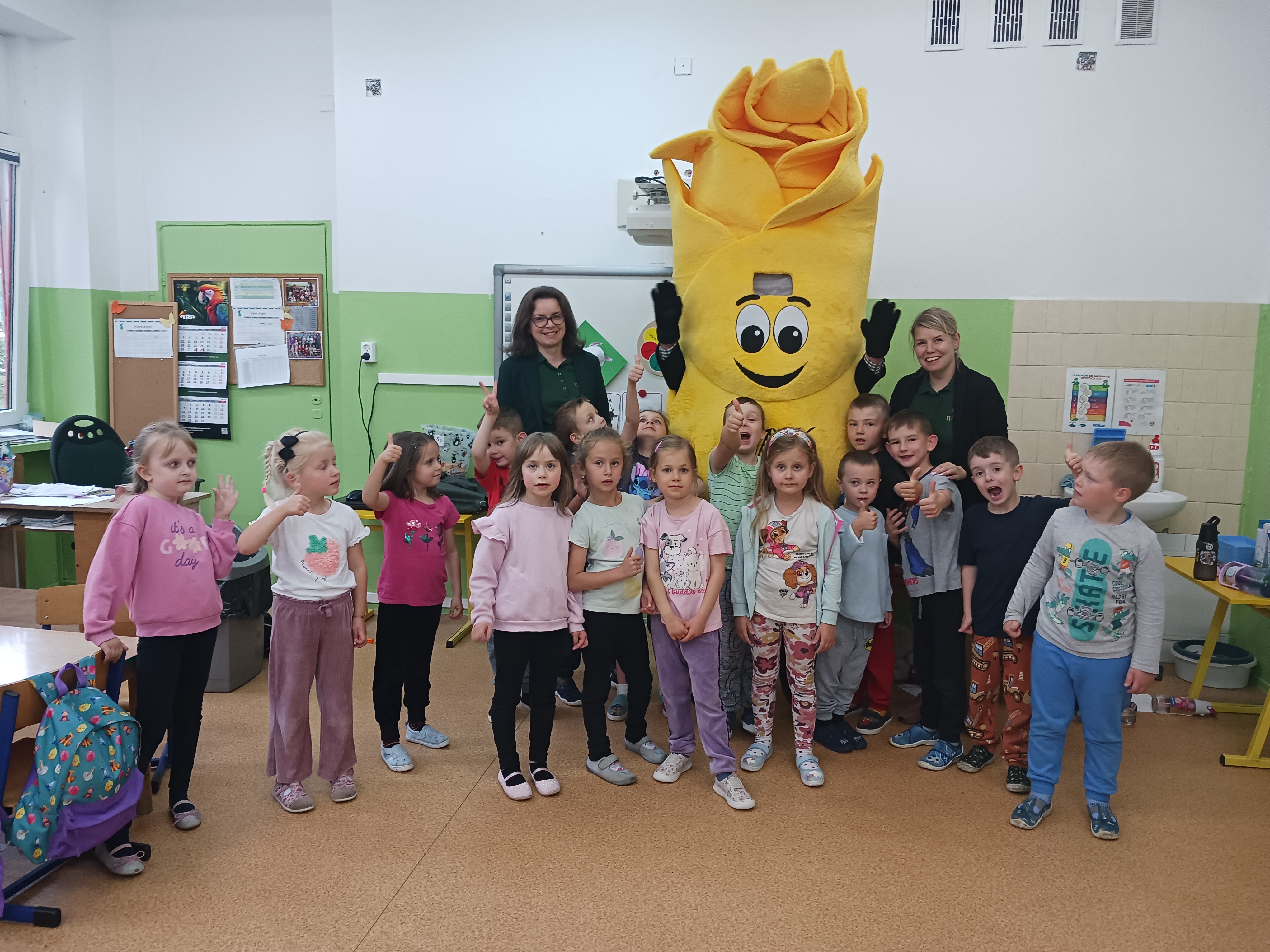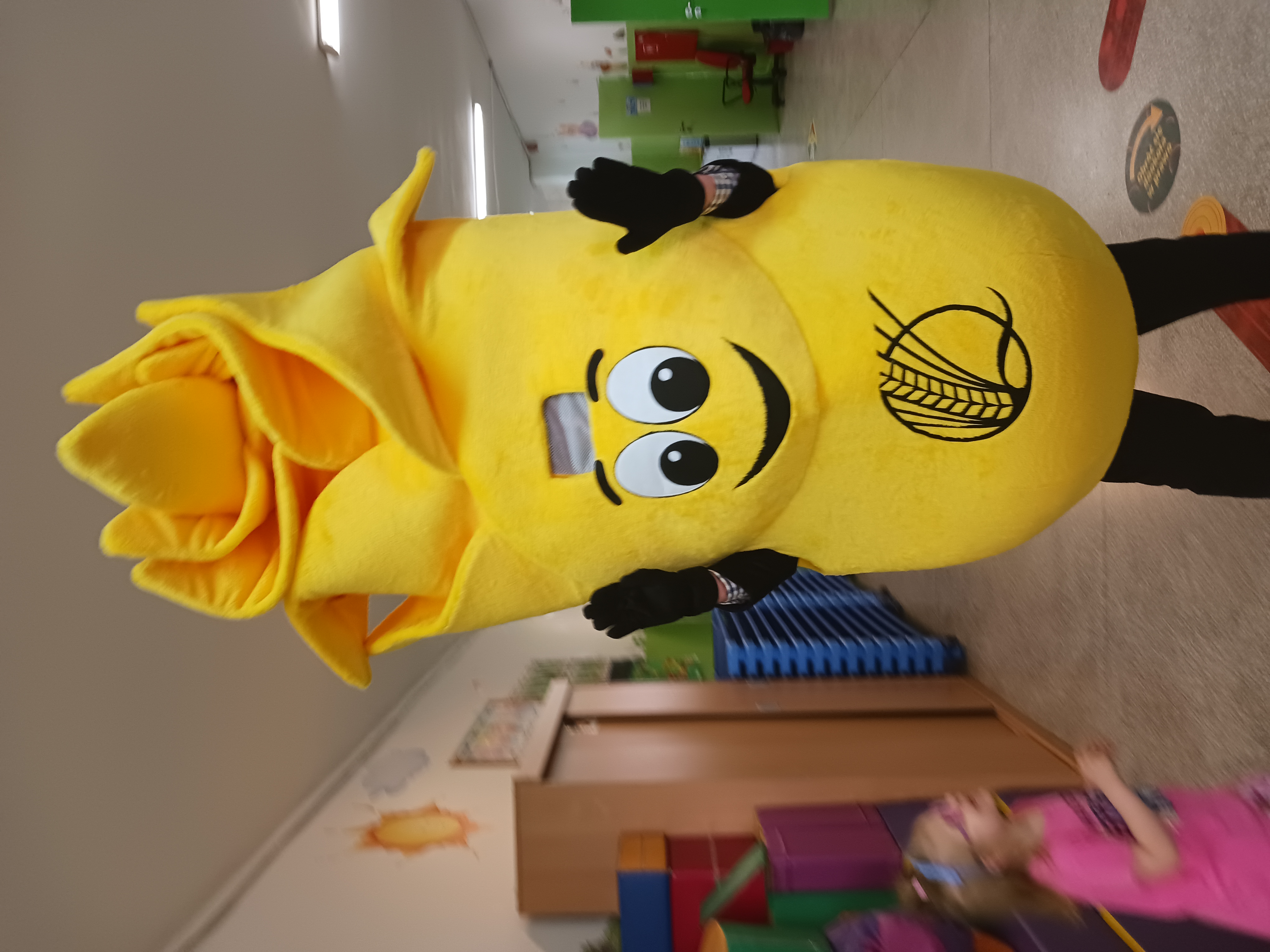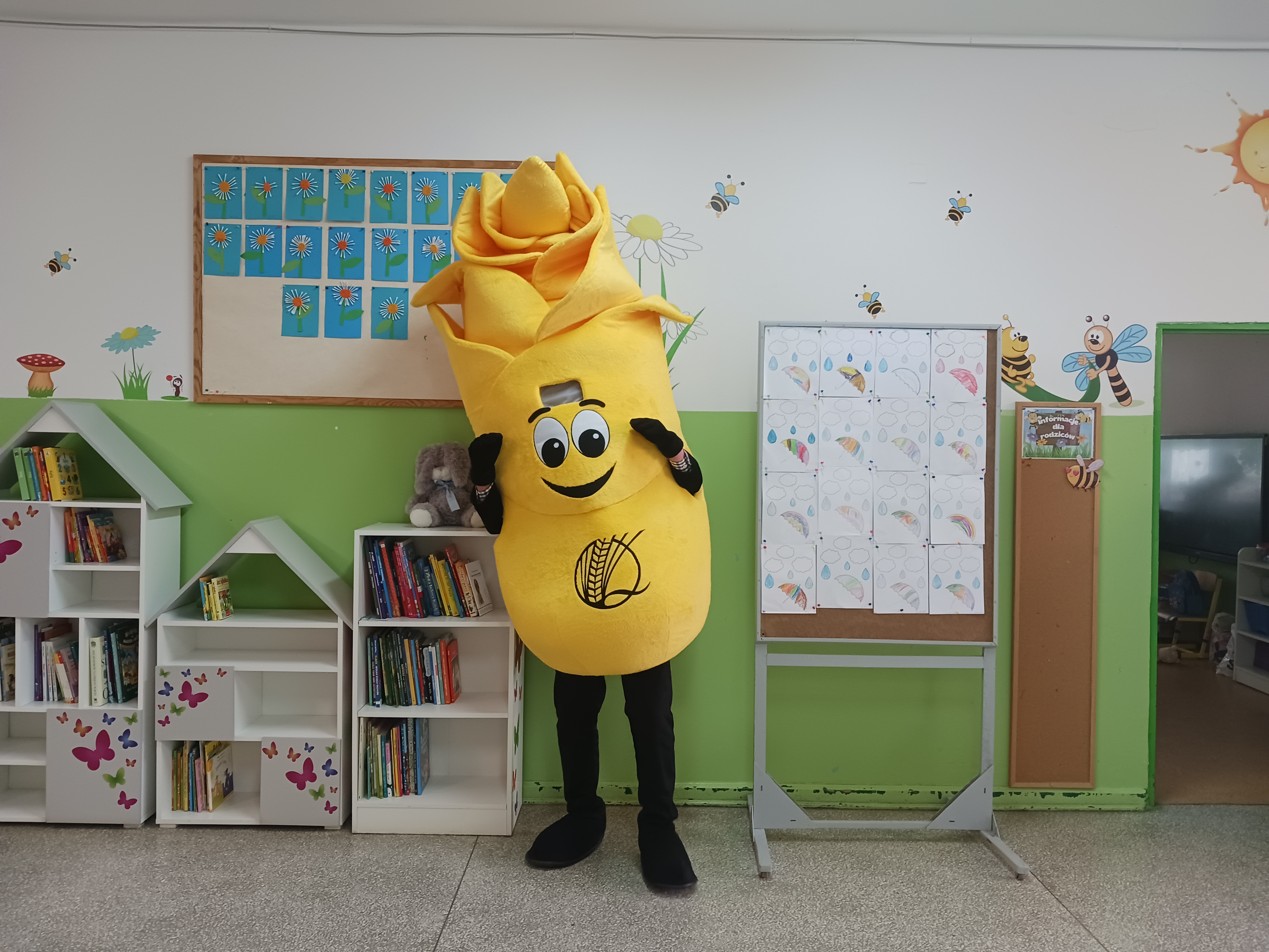 A to jeszcze nie koniec niespodzianek! Z okazji Dnia Dziecka czekała na „Żabki” super niespodzianka – przedszkole odwiedził niezwykły gość: Kłos Złotowłos, maskotka Inspekcji Jakości Handlowej Artykułów Rolno-Spożywczych (IJHARS). Spotkanie z Kłosem dostarczyło dzieciom mnóstwo radości i niezapomnianych wrażeń. Maskotka z energią i humorem opowiadała o tym, jak dbać o jakość żywności i wspólnie z dziećmi bawiła się i tańczyła.